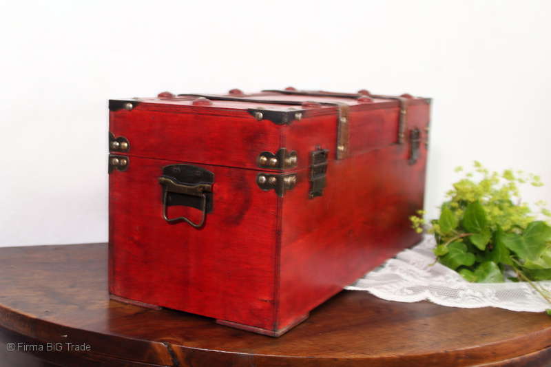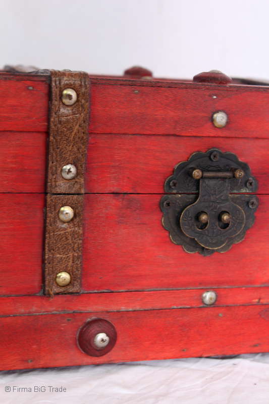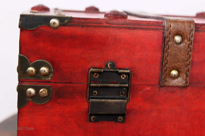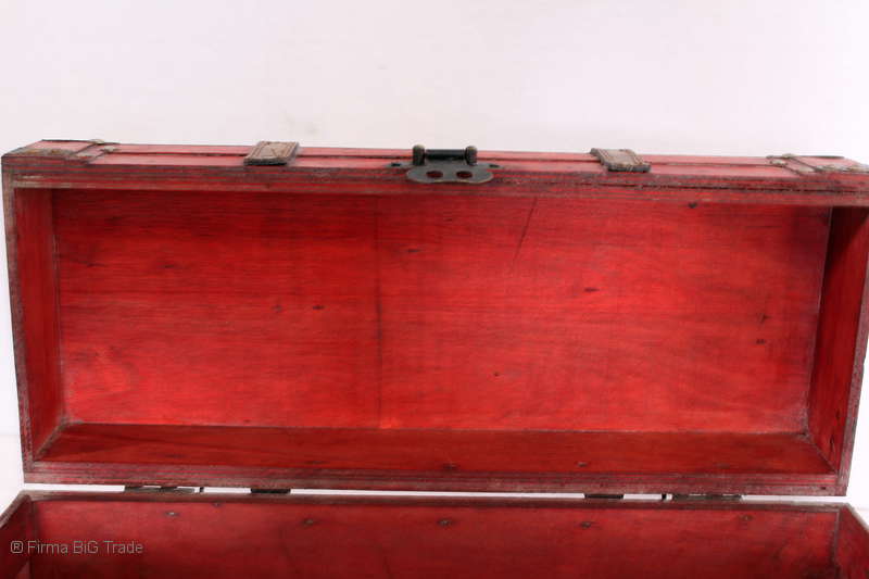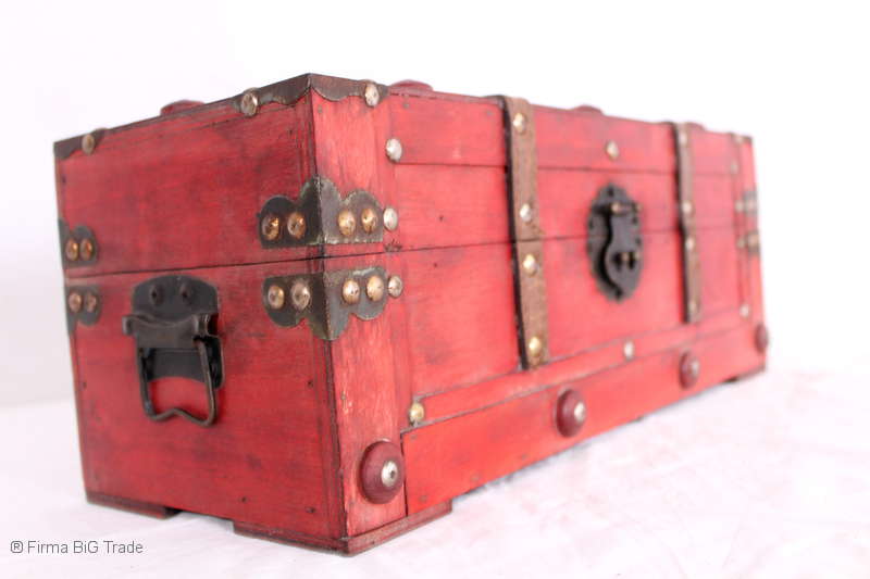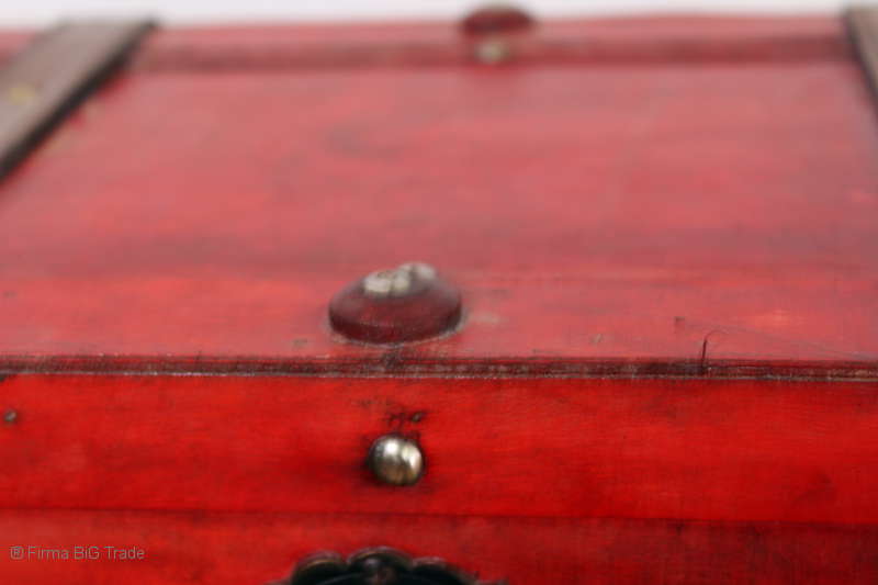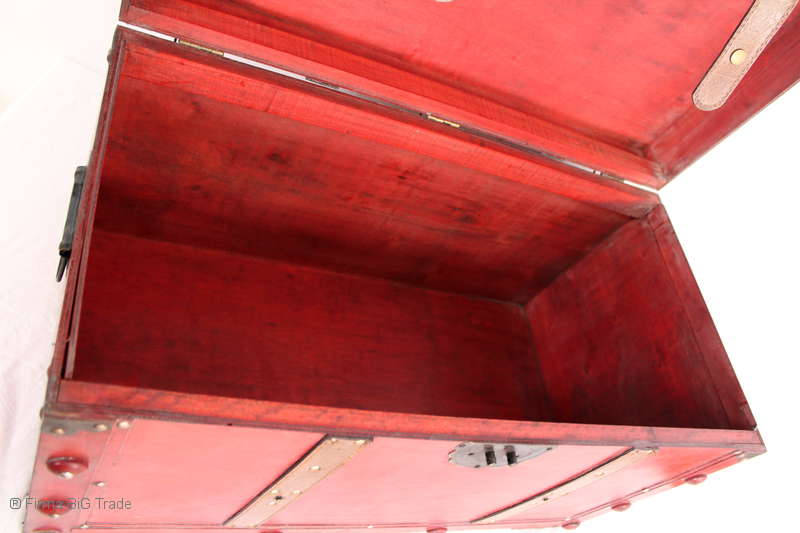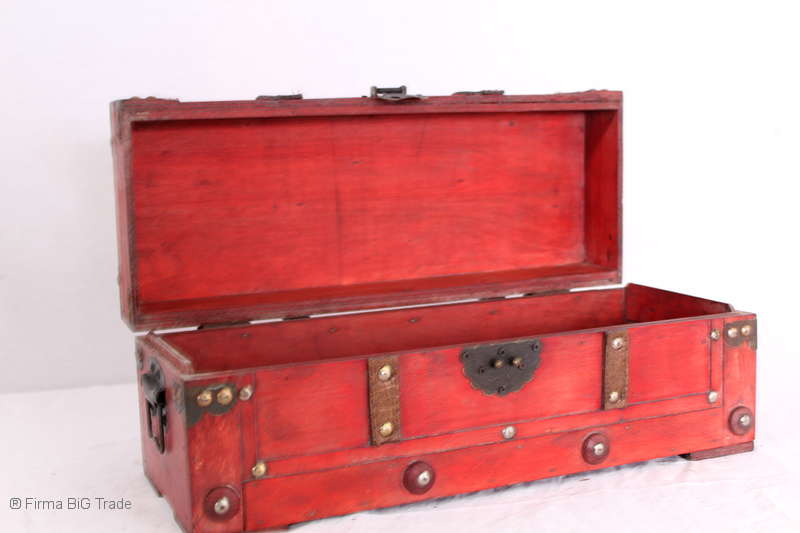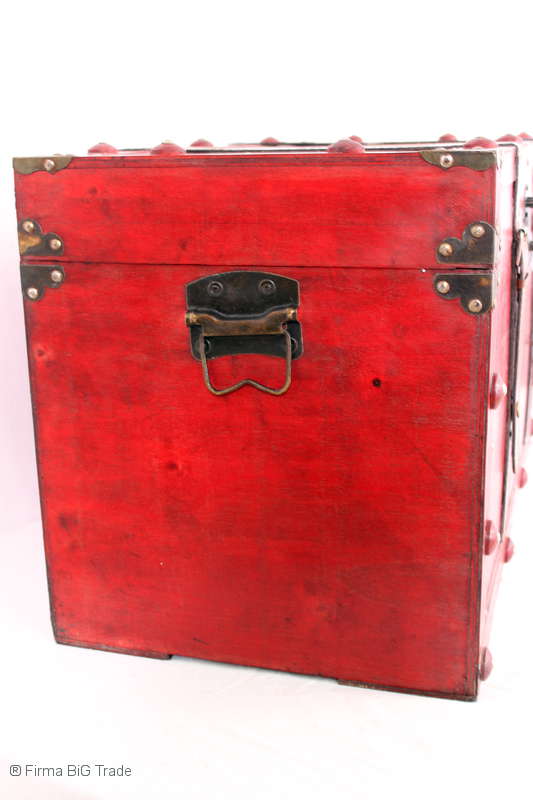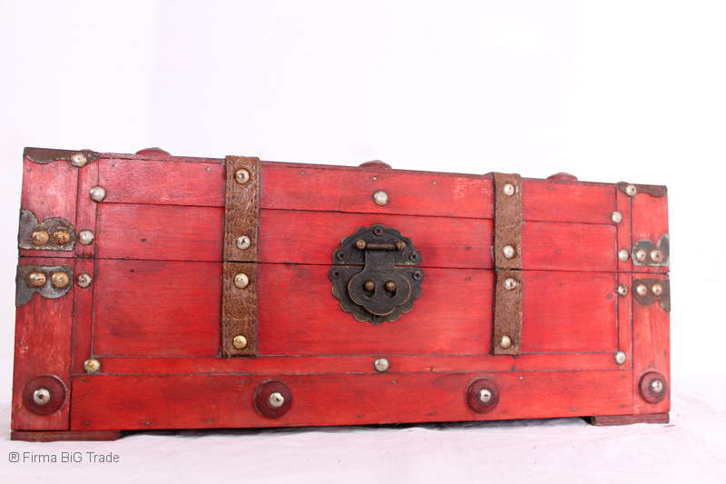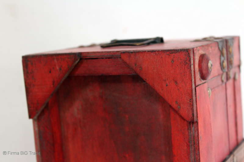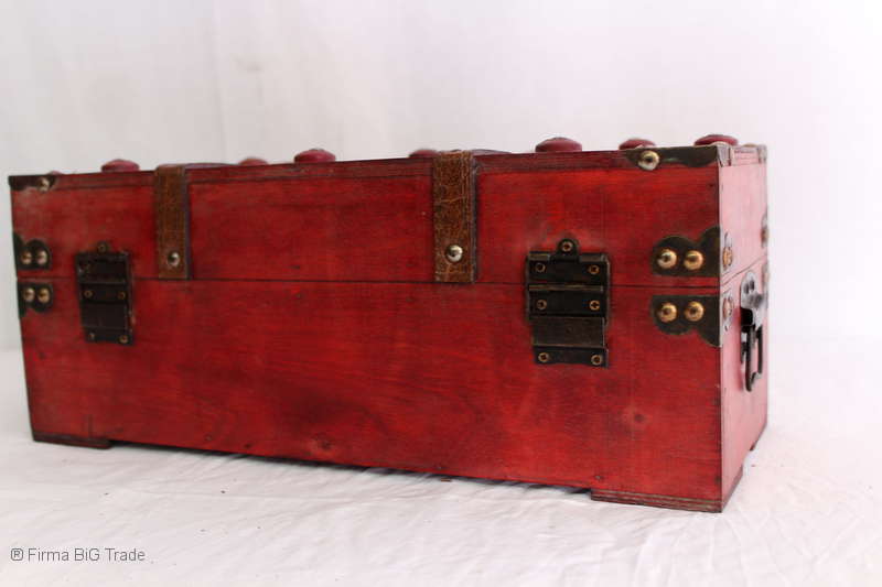 Angeboten wird ein schönes Flachdeckeltruhen Set bestehend aus 4 Truhen / Kutschertruhe / Holztruhe / Hochzeitstruhe / Holzkiste / Wäschetruhe / Tisch im antiken Stil. Die roten Holztruhen sind kontrastreich mit Lederriemen, Metallbeschlägen und Metallnägeln verziert. An den Seiten befinden sich zwei Metalltragegriffe und auf der Vorderseite ein Klappschloss zum Verschließen. Die Flachdeckeltruhen sind neu, können aber hier und da produktionsbedingte Fehler aufweisen. Die Holztruhen haben vier unterschiedliche Größen.