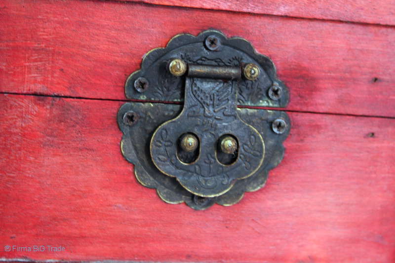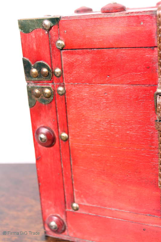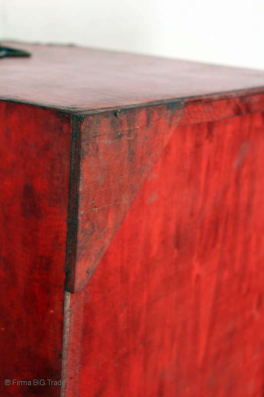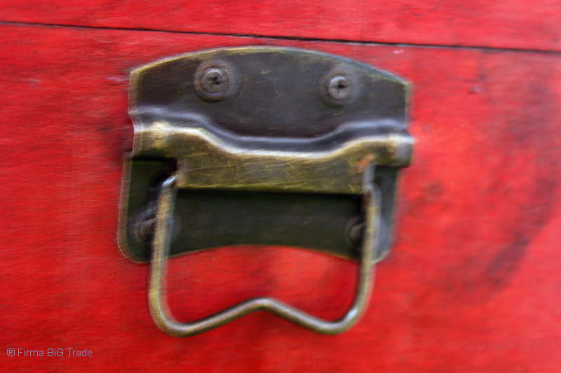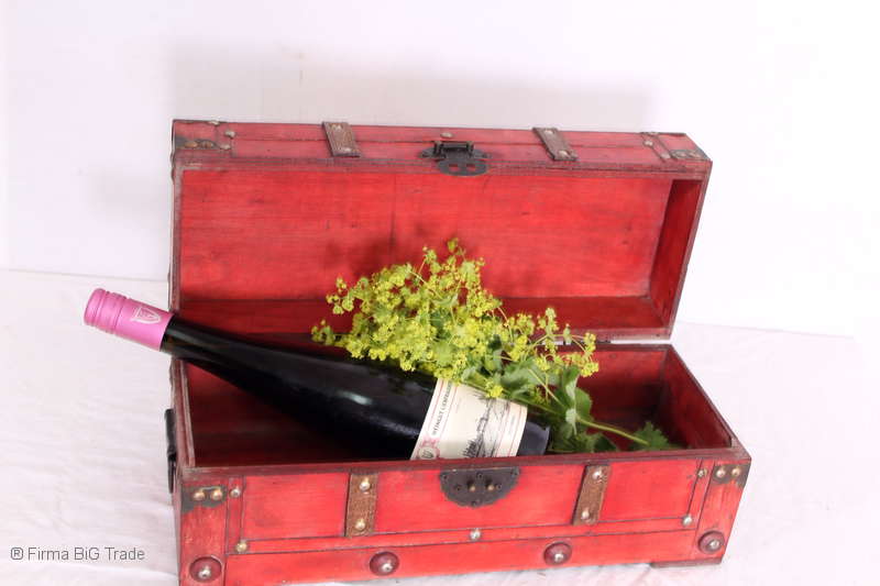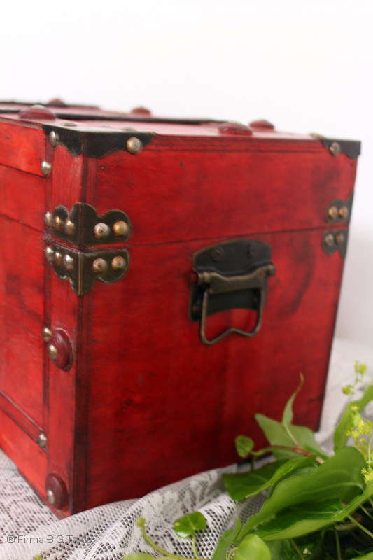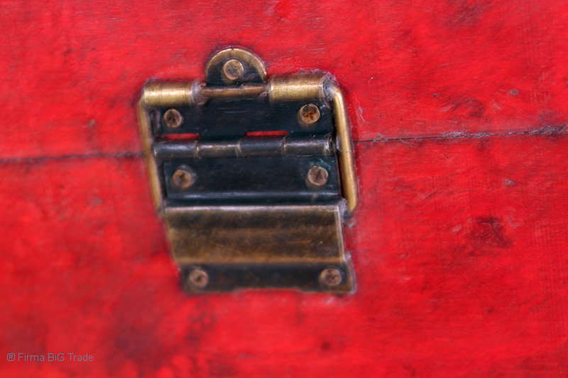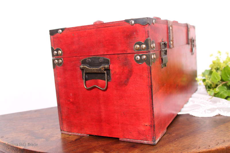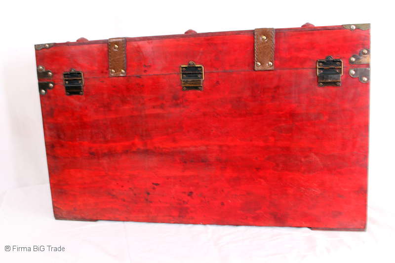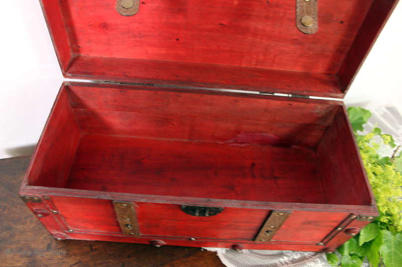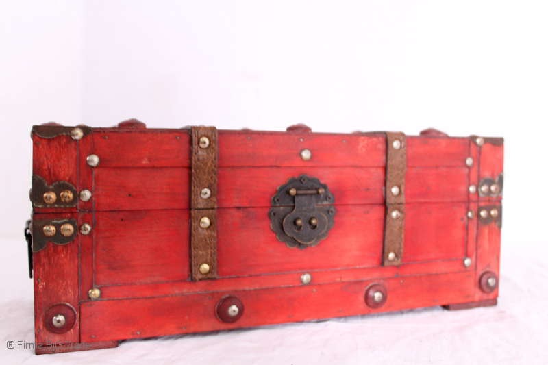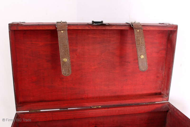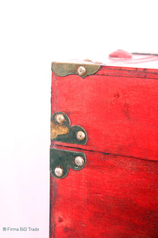 Angeboten wird ein schönes Flachdeckeltruhen Set bestehend aus 4 Truhen / Kutschertruhe / Holztruhe / Hochzeitstruhe / Holzkiste / Wäschetruhe / Tisch im antiken Stil. Die roten Holztruhen sind kontrastreich mit Lederriemen, Metallbeschlägen und Metallnägeln verziert. An den Seiten befinden sich zwei Metalltragegriffe und auf der Vorderseite ein Klappschloss zum Verschließen. Die Flachdeckeltruhen sind neu, können aber hier und da produktionsbedingte Fehler aufweisen. Die Holztruhen haben vier unterschiedliche Größen.