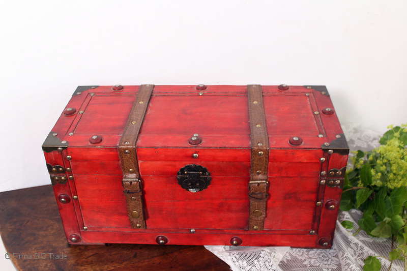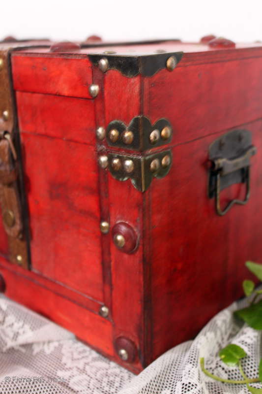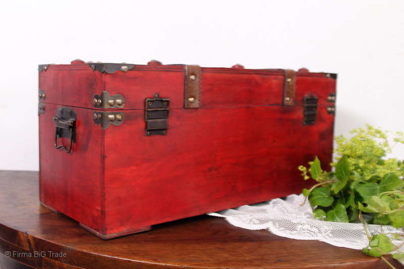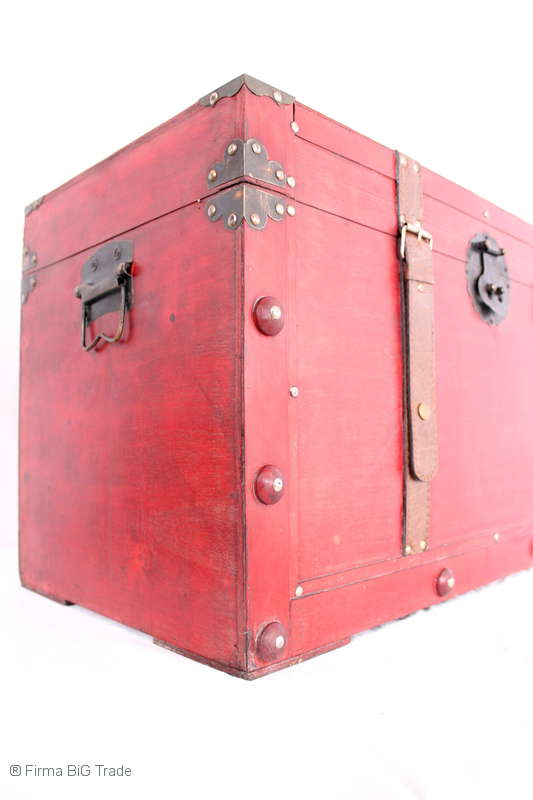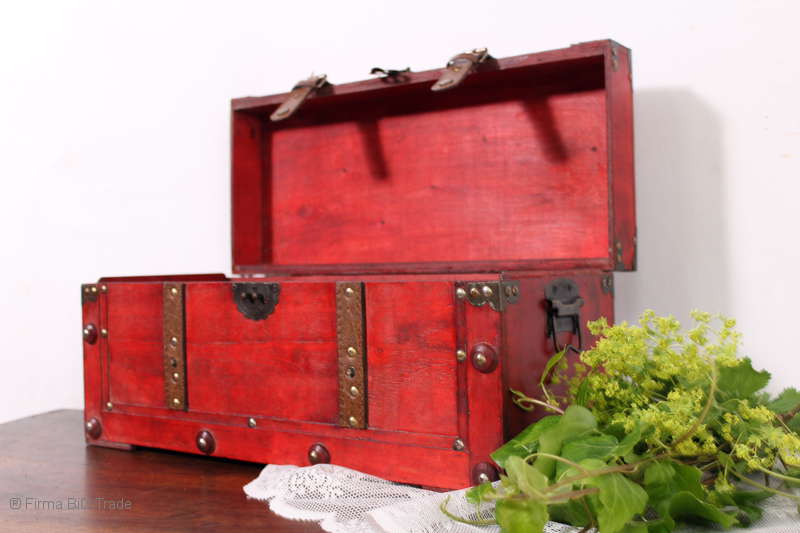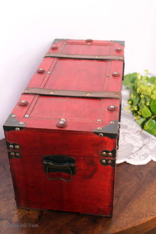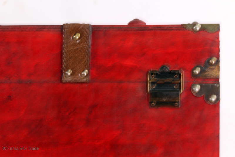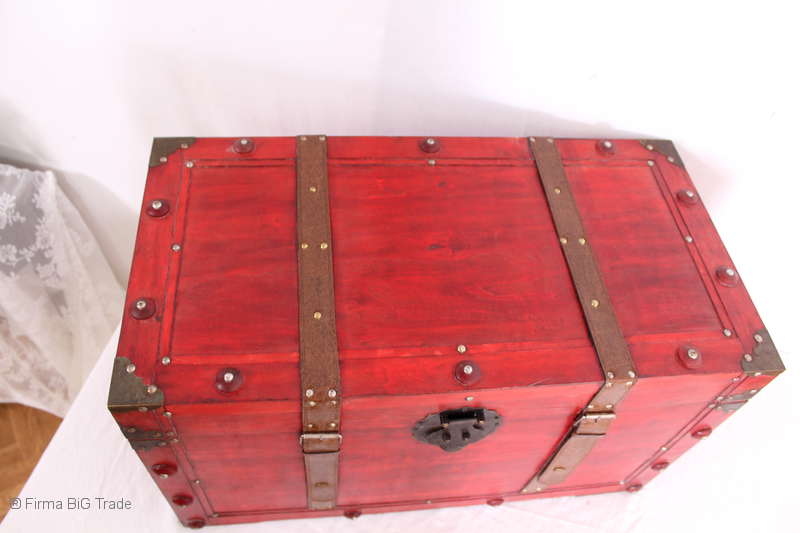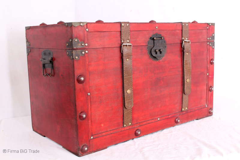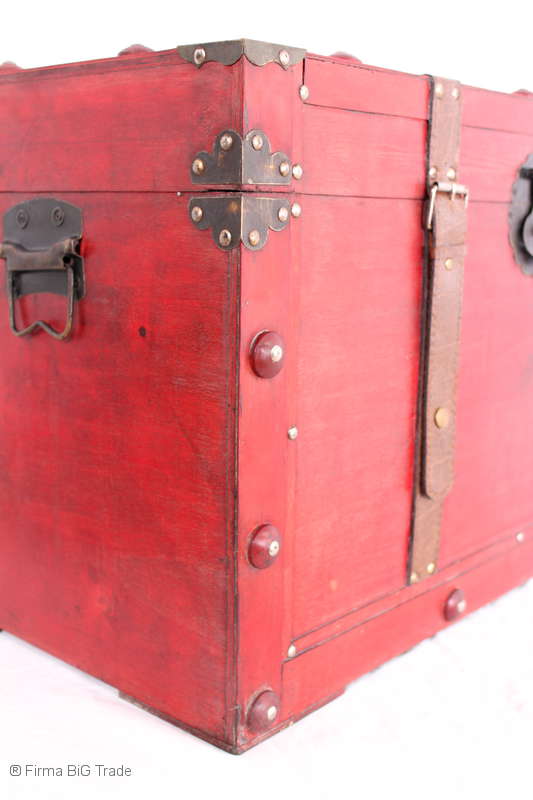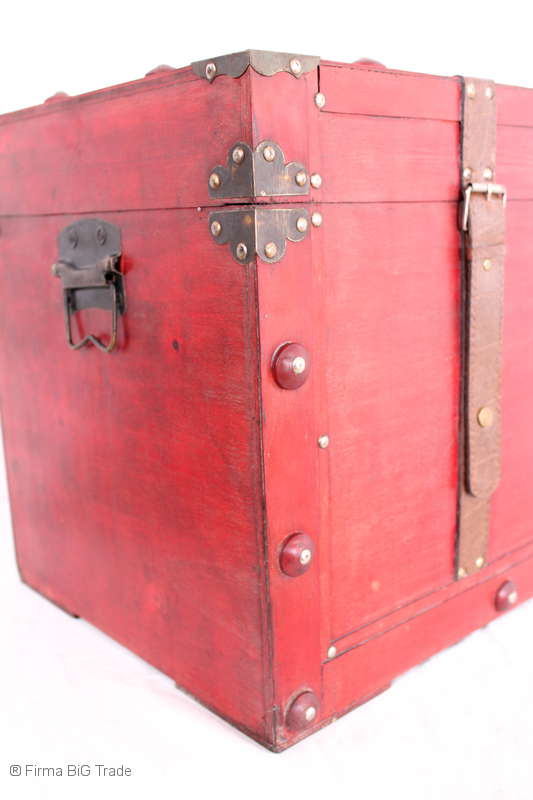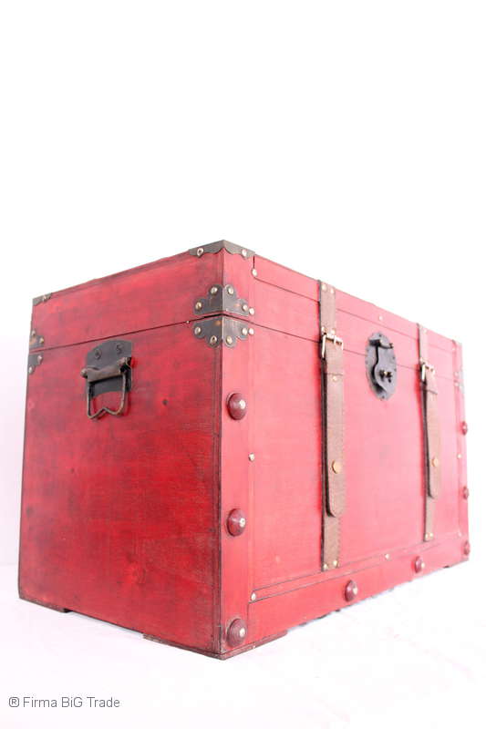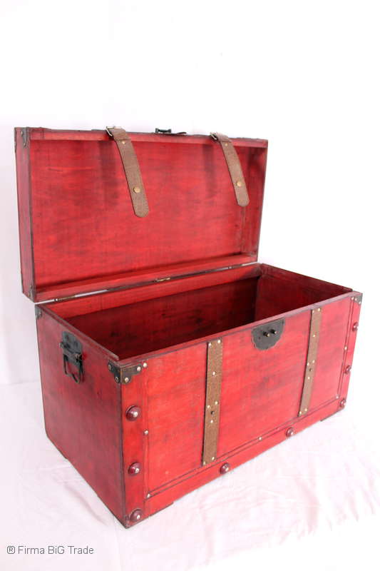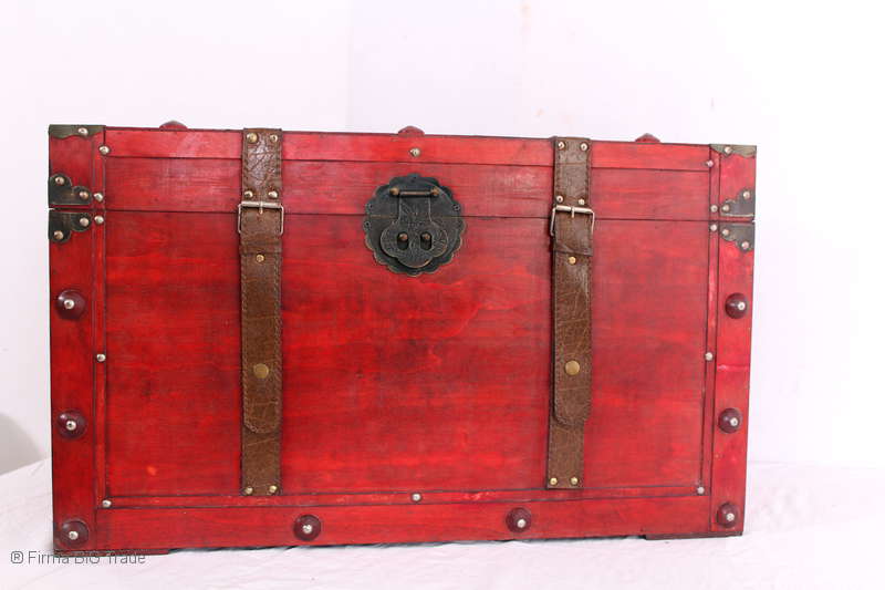 Angeboten wird eine schöne Kutschertruhe / Holztruhe / Flachdeckeltruhe / Holzkiste / Wäschetruhe / Tisch im antiken Stil. Die rote Holztruhe ist kontrastreich mit Lederriemen, Metallbeschlägen und Metallnägeln verziert. An den Seiten befinden sich zwei Metalltragegriffe und auf der Vorderseite ein Klappschloss zum Verschließen. Die Flachdeckeltruhe ist neu, kann aber hier und da produktionsbedingte Fehler aufweisen. Wir bieten die schöne Holztruhe in 4 Größen an.