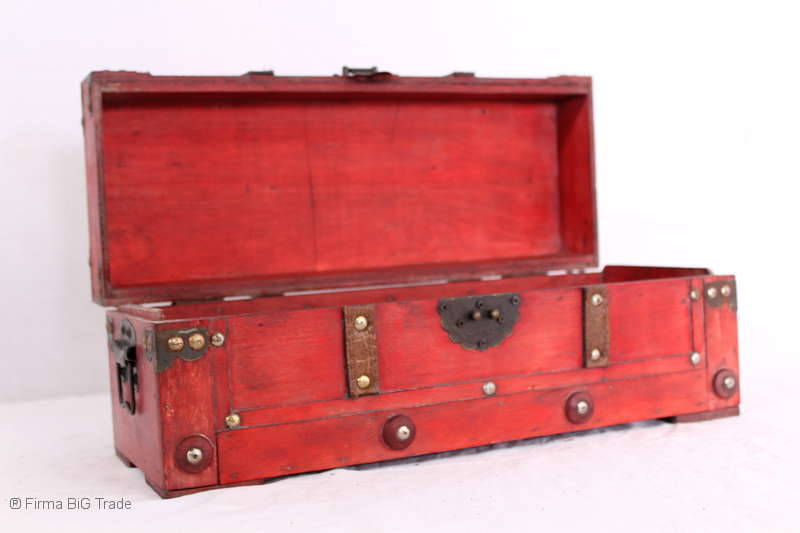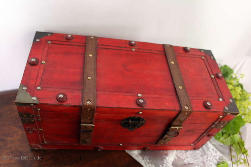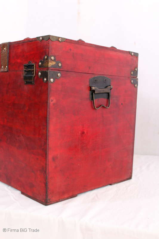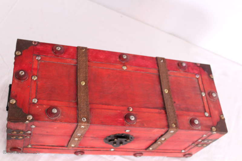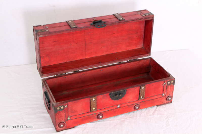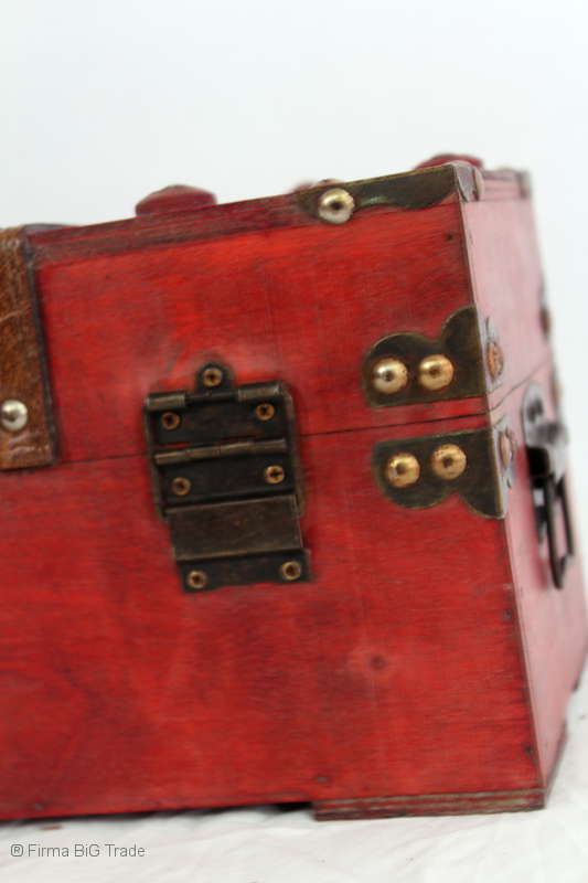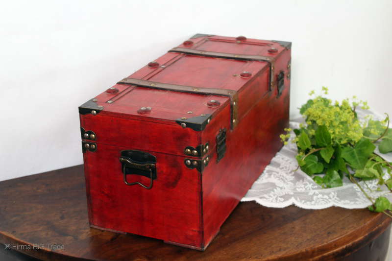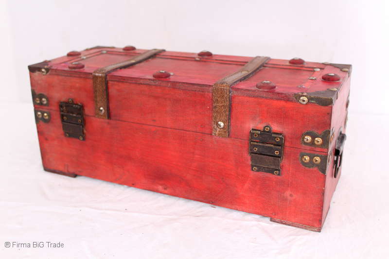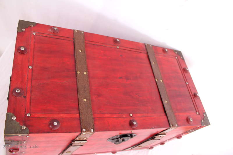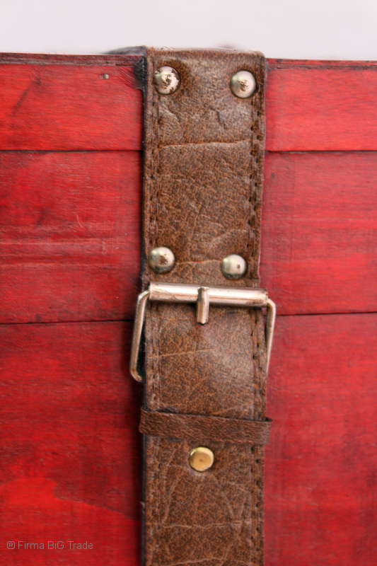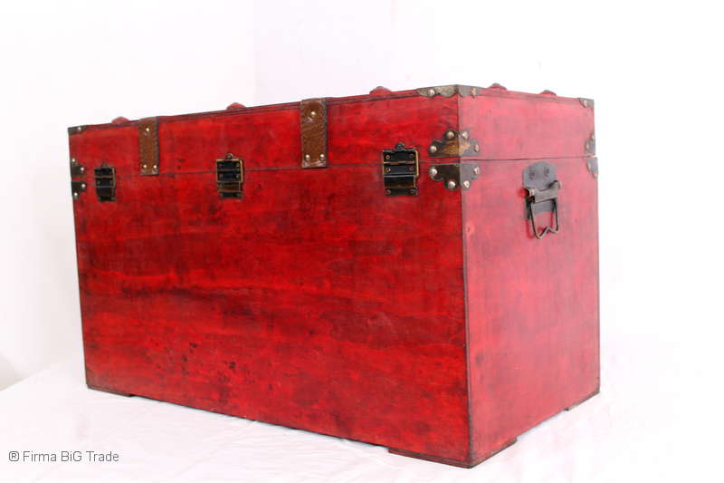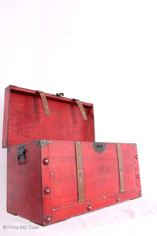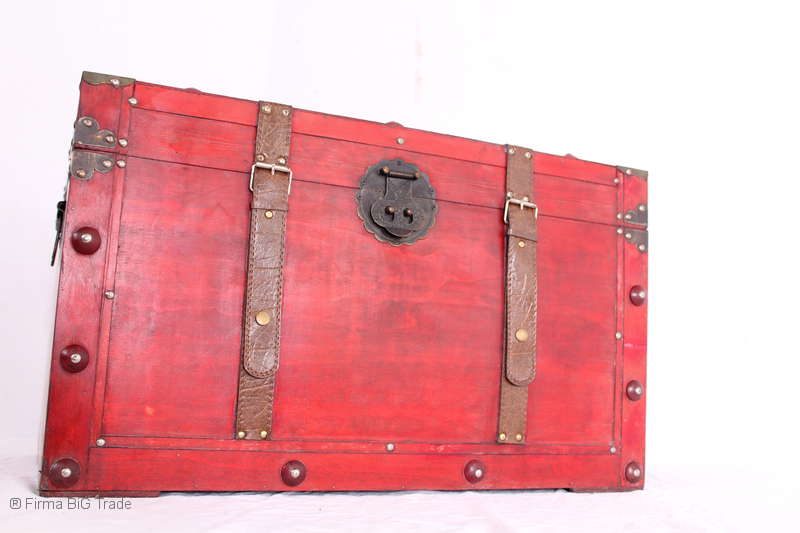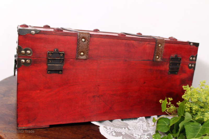 Angeboten wird eine schöne Kutschertruhe / Holztruhe / Flachdeckeltruhe / Holzkiste / Wäschetruhe / Tisch im antiken Stil. Die rote Holztruhe ist kontrastreich mit Lederriemen, Metallbeschlägen und Metallnägeln verziert. An den Seiten befinden sich zwei Metalltragegriffe und auf der Vorderseite ein Klappschloss zum Verschließen. Die Flachdeckeltruhe ist neu, kann aber hier und da produktionsbedingte Fehler aufweisen. Wir bieten die schöne Holztruhe in 4 Größen an.
