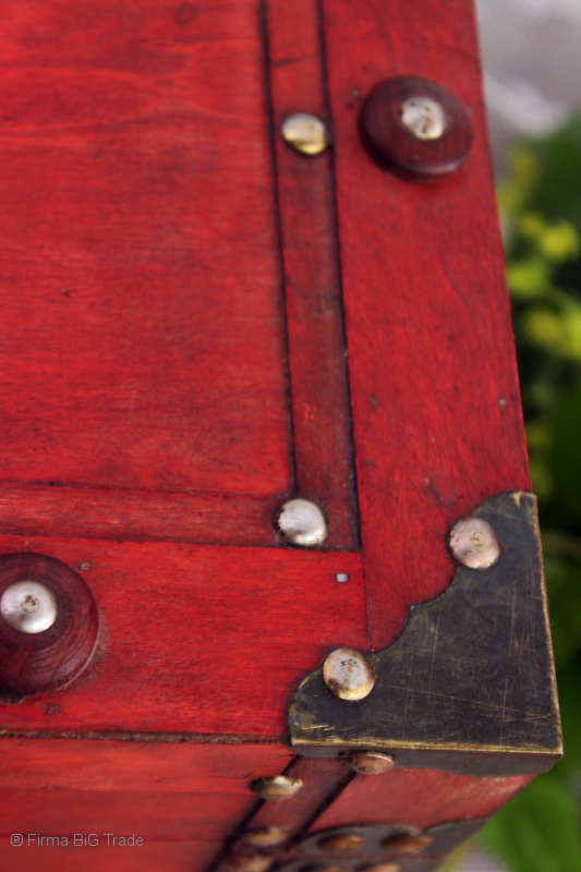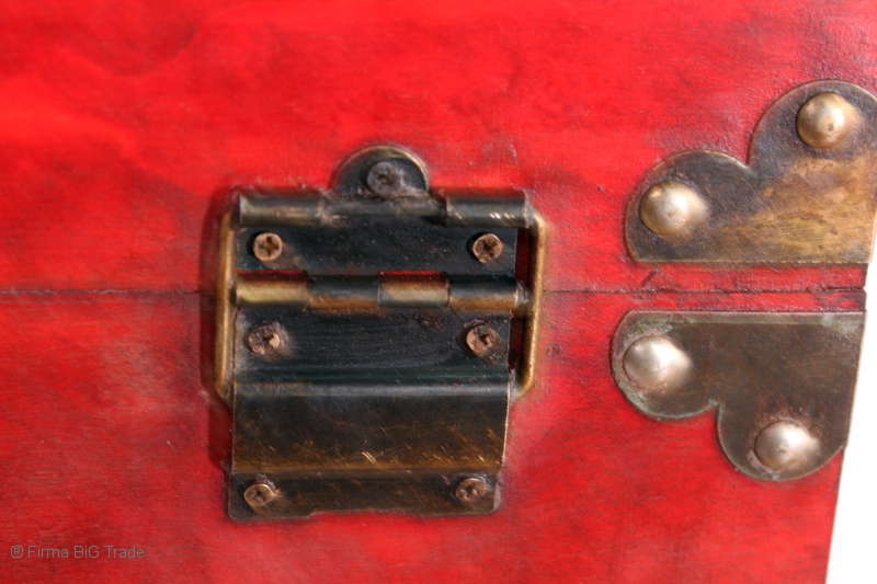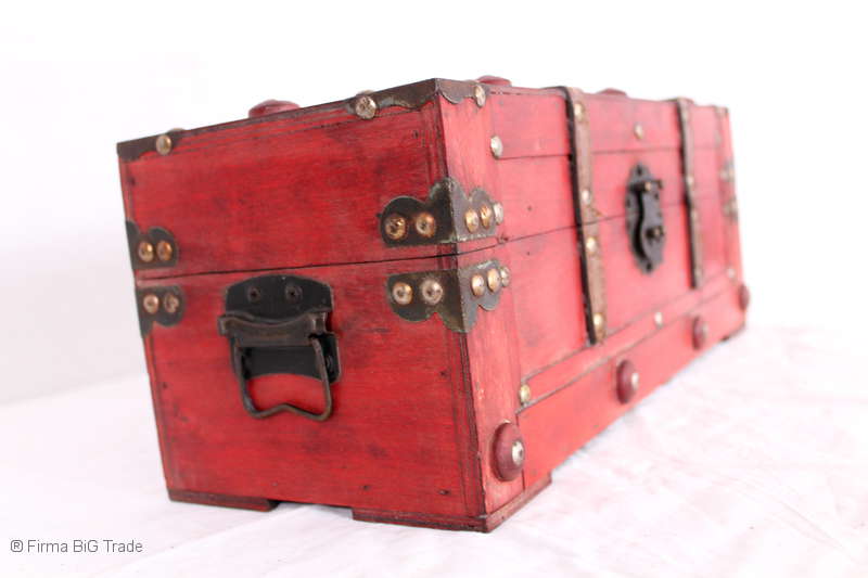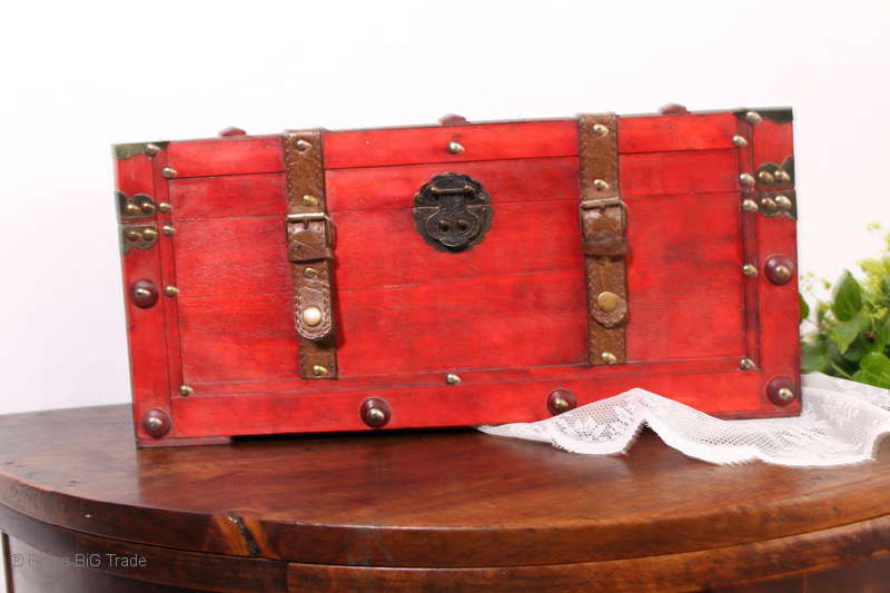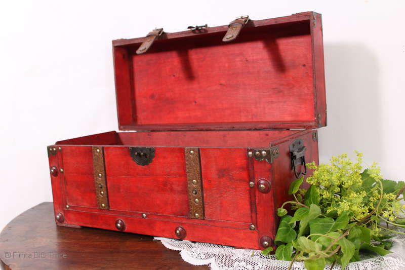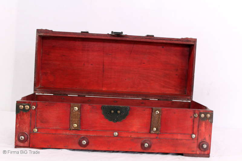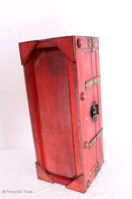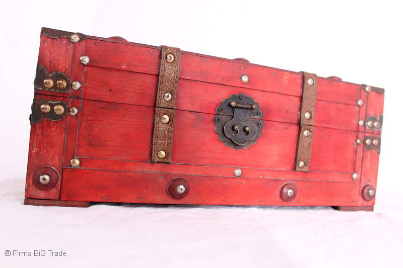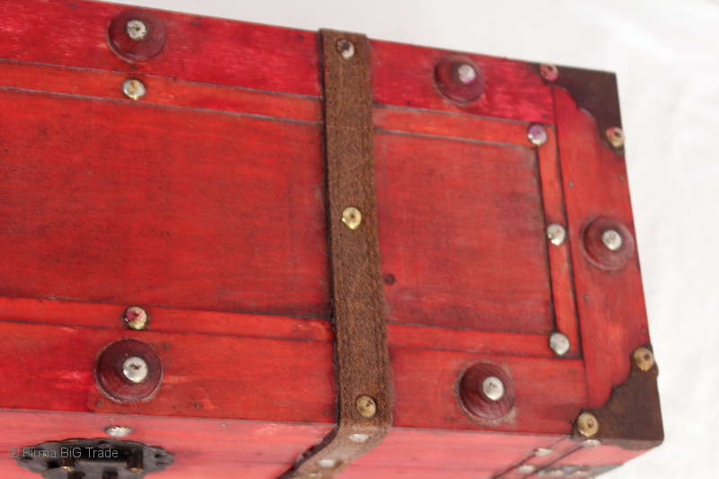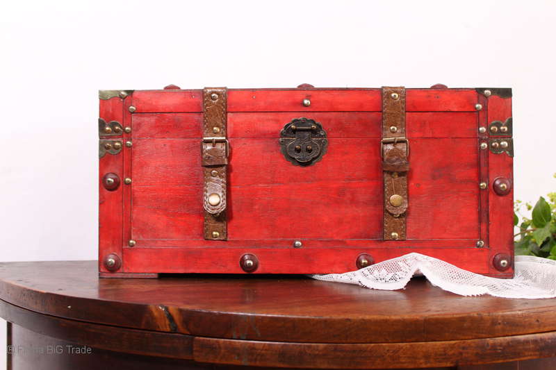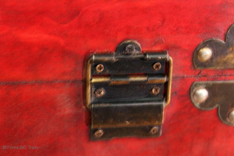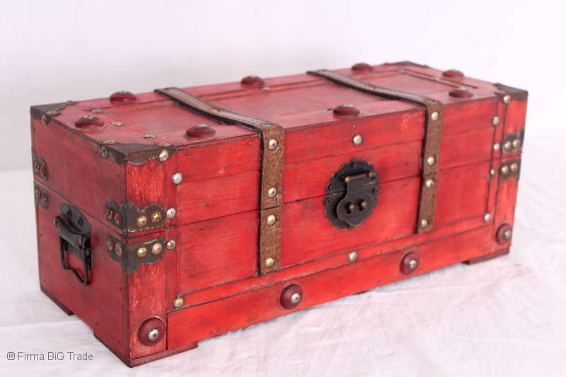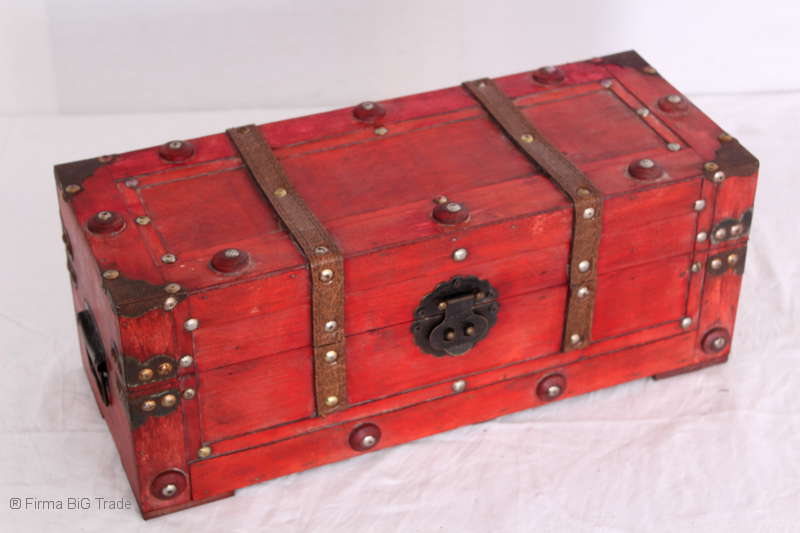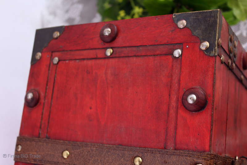 Angeboten wird eine schöne Kutschertruhe / Holztruhe / Flachdeckeltruhe / Holzkiste / Wäschetruhe / Tisch im antiken Stil. Die rote Holztruhe ist kontrastreich mit Lederriemen, Metallbeschlägen und Metallnägeln verziert. An den Seiten befinden sich zwei Metalltragegriffe und auf der Vorderseite ein Klappschloss zum Verschließen. Die Flachdeckeltruhe ist neu, kann aber hier und da produktionsbedingte Fehler aufweisen. Wir bieten die schöne Holztruhe in 4 Größen an.