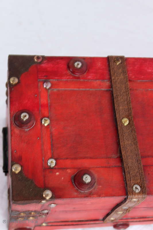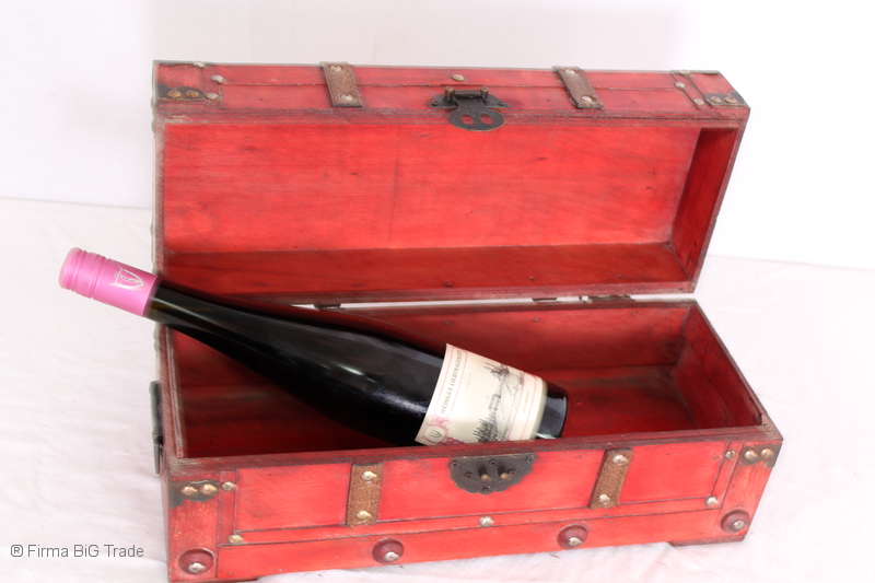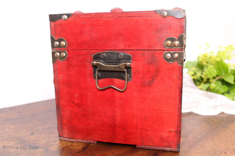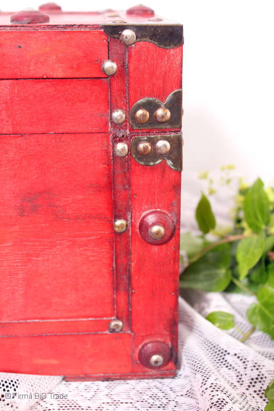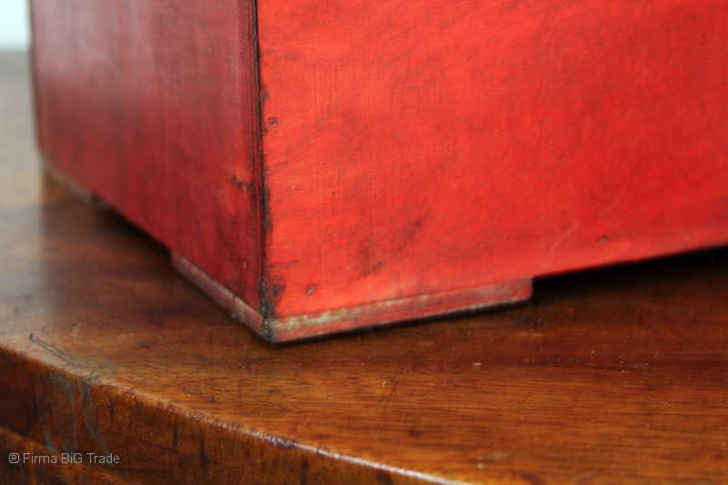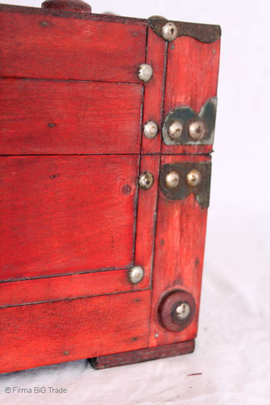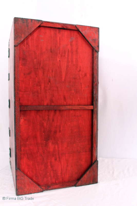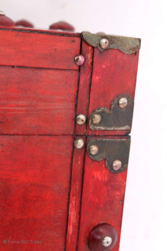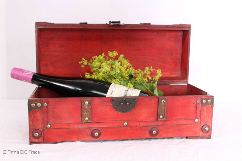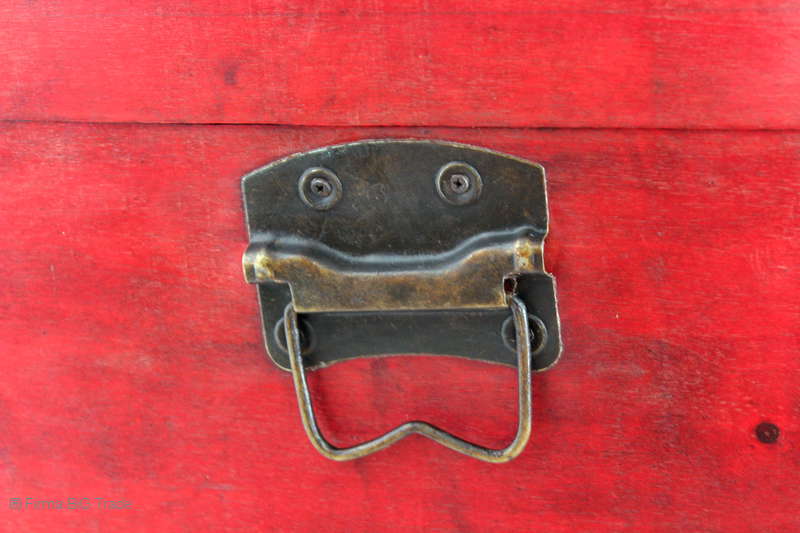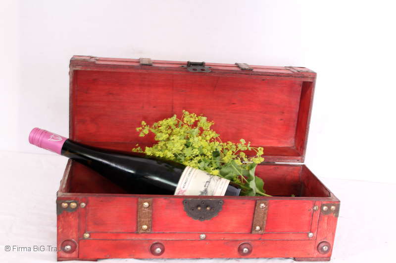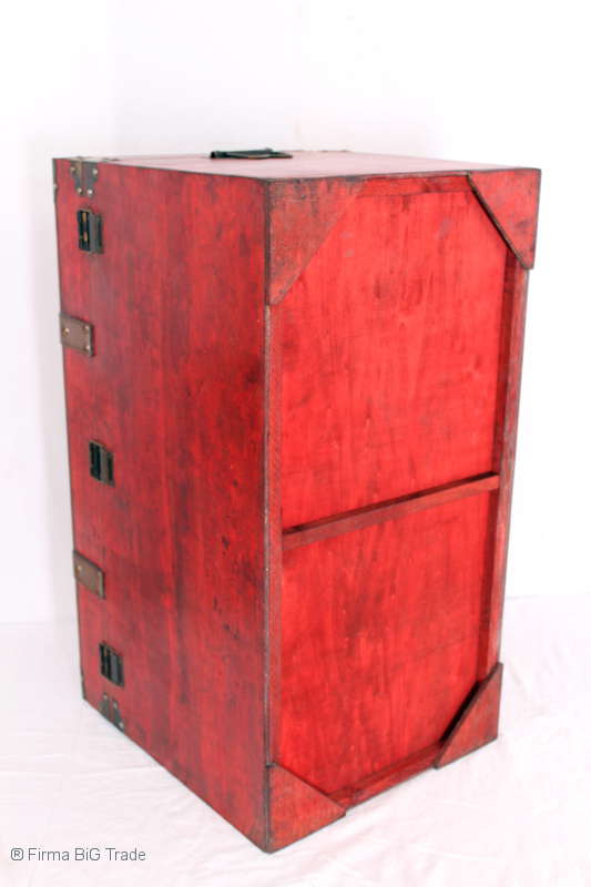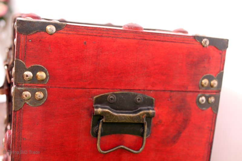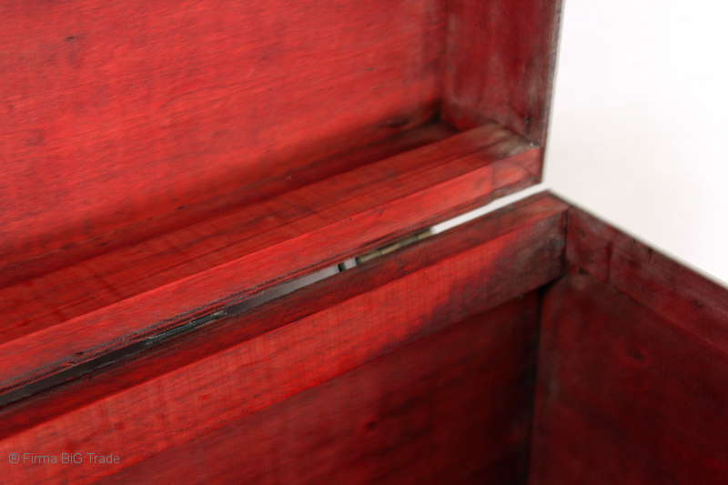 Angeboten wird eine schöne Kutschertruhe / Holztruhe / Flachdeckeltruhe / Holzkiste / Wäschetruhe / Tisch im antiken Stil. Die rote Holztruhe ist kontrastreich mit Lederriemen, Metallbeschlägen und Metallnägeln verziert. An den Seiten befinden sich zwei Metalltragegriffe und auf der Vorderseite ein Klappschloss zum Verschließen. Die Flachdeckeltruhe ist neu, kann aber hier und da produktionsbedingte Fehler aufweisen. Wir bieten die schöne Holztruhe in 4 Größen an.