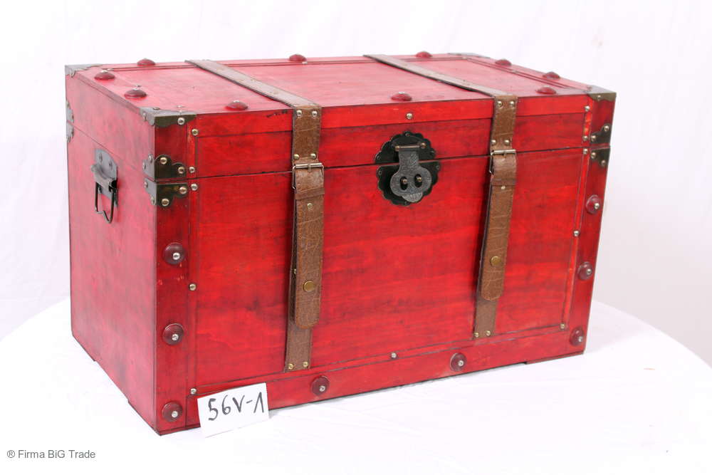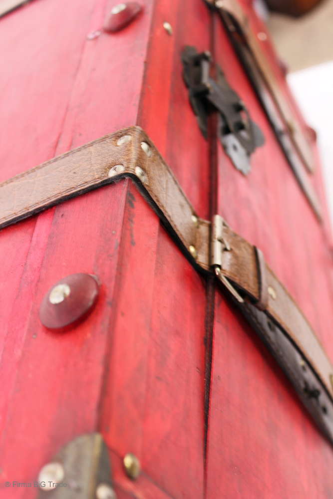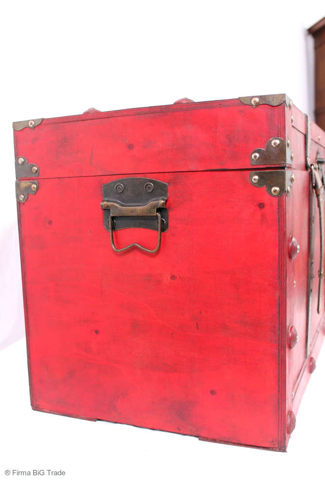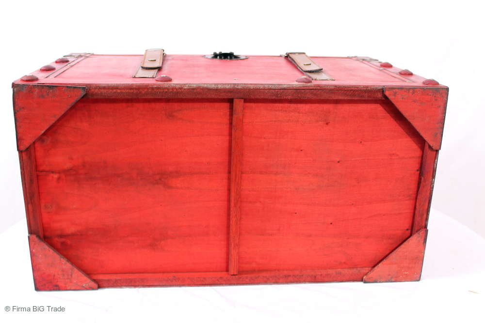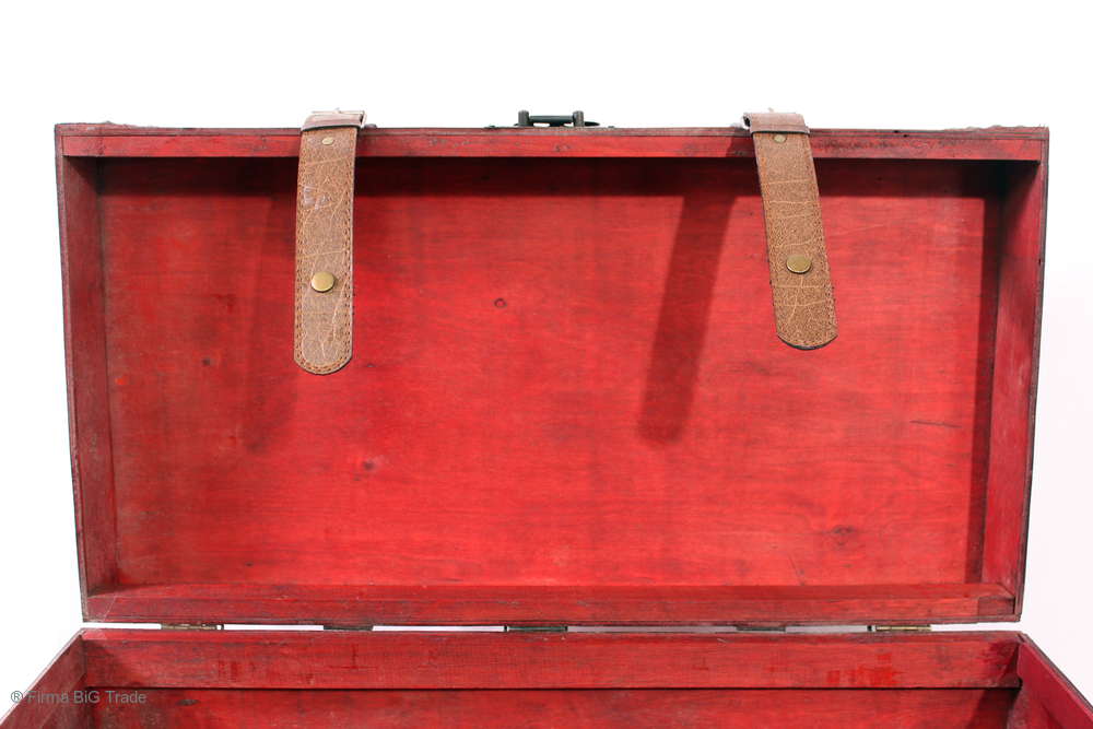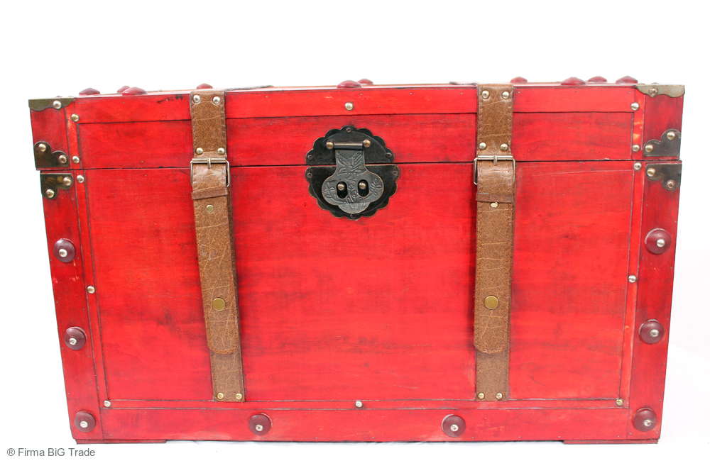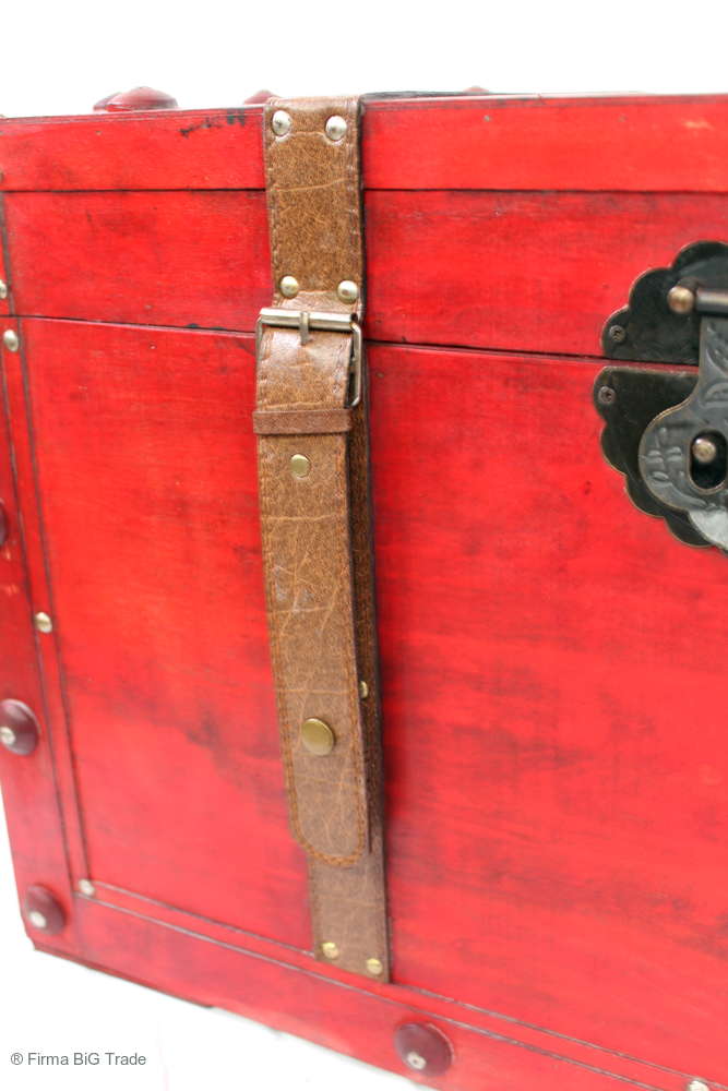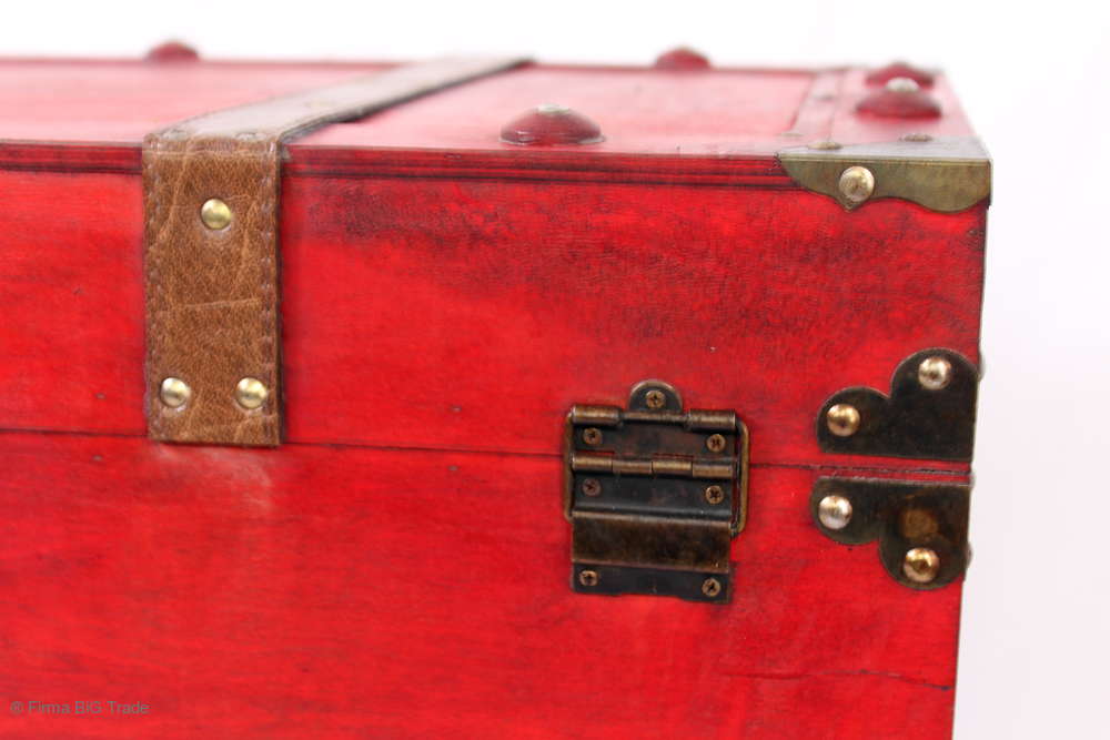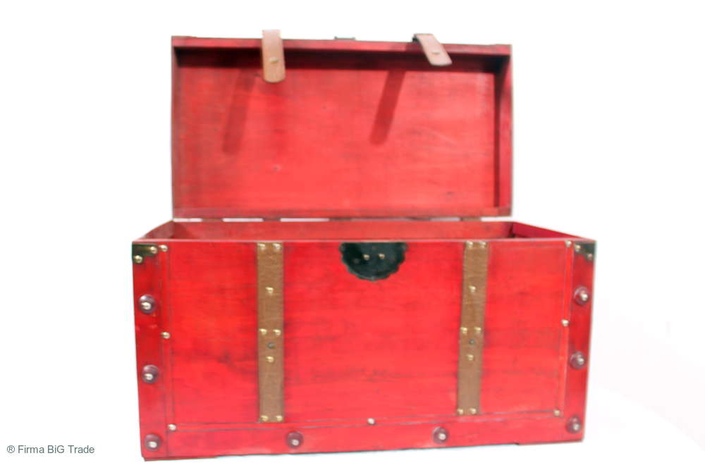 Angeboten wird eine schöne Kutschertruhe / Holztruhe / Flachdeckeltruhe / Holzkiste / Wäschetruhe / Tisch im antiken Stil. Die rote Holztruhe ist kontrastreich mit Lederriemen, Metallbeschlägen und Metallnägeln verziert. An den Seiten befinden sich zwei Metalltragegriffe und auf der Vorderseite ein Klappschloss zum Verschließen. Die Flachdeckeltruhe hat Alters- und Gebrauchsspuren u.a. Kratzer, Flecken, Stoßstellen, der Deckel ist verzogen, im Inneren hat sich eine Holzleiste gelöst (siehe Bilder). Wir bieten die schöne Holztruhe in 4 Größen an.