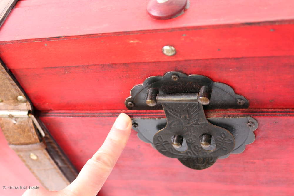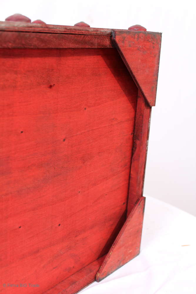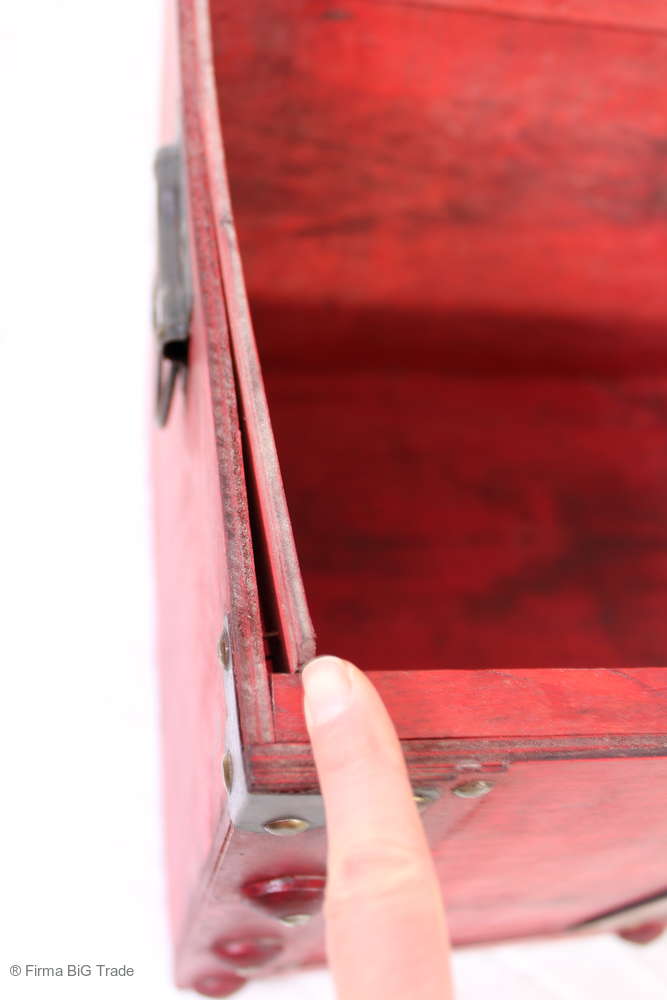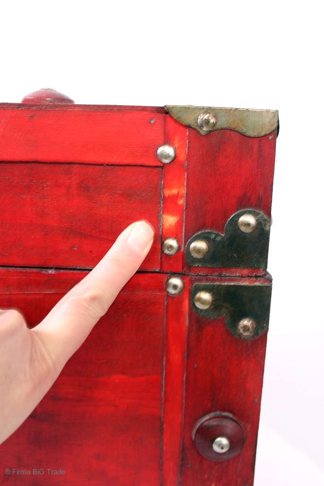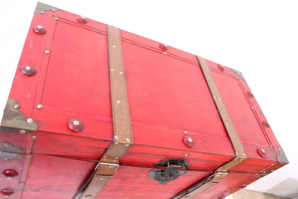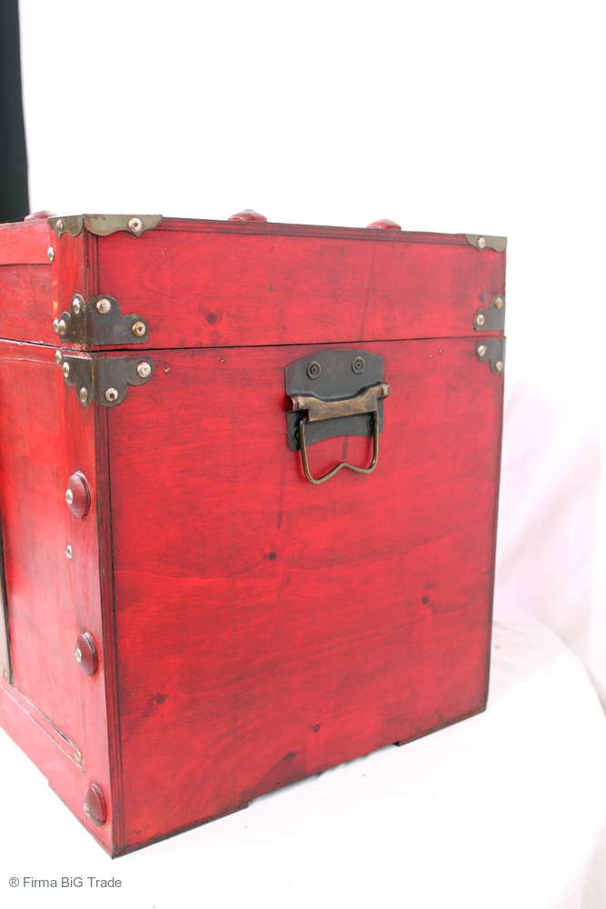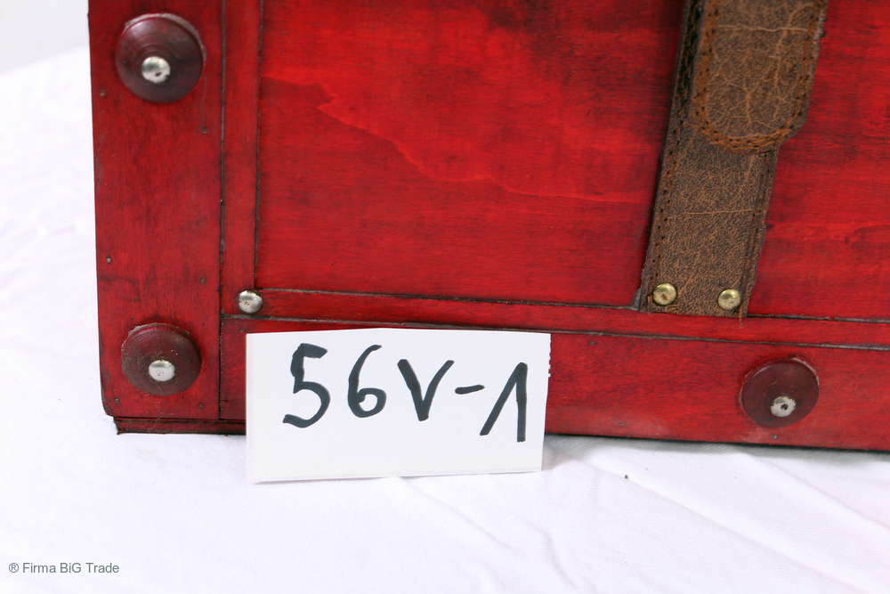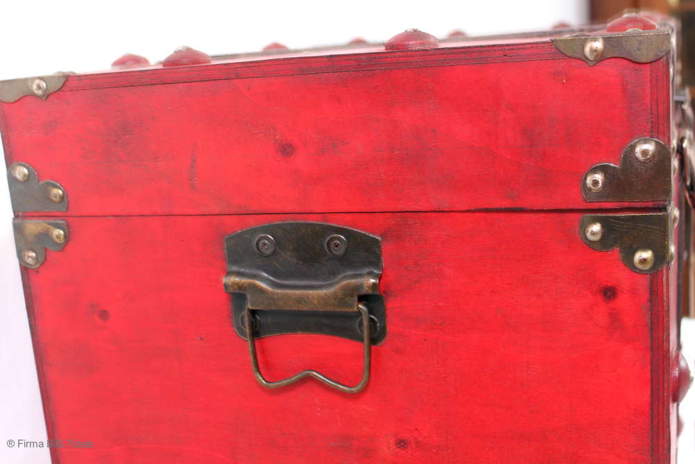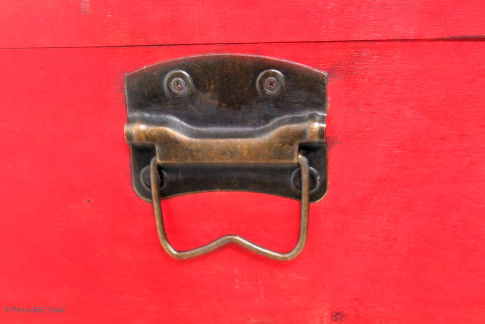Angeboten wird eine schöne Kutschertruhe / Holztruhe / Flachdeckeltruhe / Holzkiste / Wäschetruhe / Tisch im antiken Stil. Die rote Holztruhe ist kontrastreich mit Lederriemen, Metallbeschlägen und Metallnägeln verziert. An den Seiten befinden sich zwei Metalltragegriffe und auf der Vorderseite ein Klappschloss zum Verschließen. Die Flachdeckeltruhe hat Alters- und Gebrauchsspuren u.a. Kratzer, Flecken, Stoßstellen, der Deckel ist verzogen, im Inneren hat sich eine Holzleiste gelöst (siehe Bilder). Wir bieten die schöne Holztruhe in 4 Größen an.