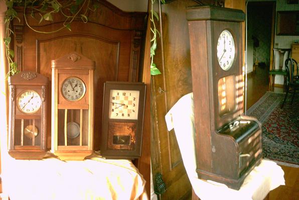 4 antike Wanduhren (3 Regulatoren + 1 Stempeluhr)