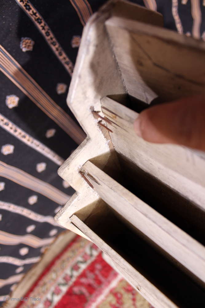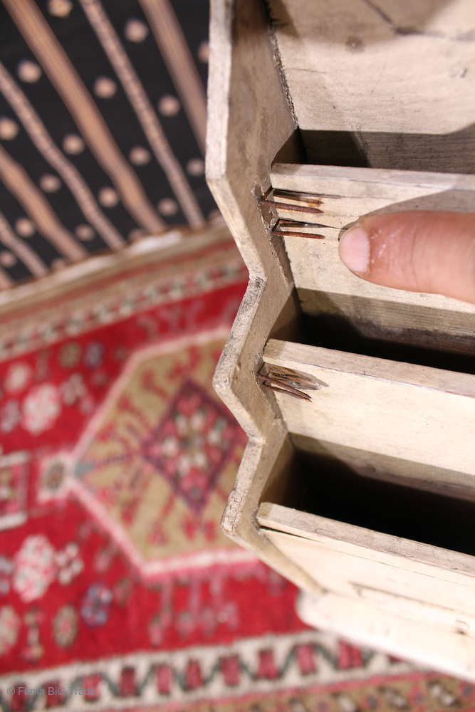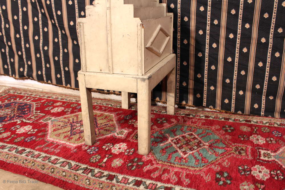 Angeboten wird ein formschöner antiker Art Déco Zeitungsständer / Magazinständer. Der antike Zeitungsständer ist treppenförmig gestaltet und stehe auf einem kantigen Gestell, die Seiten sind mit Rauten verziert. Der ausgefallen antike Zeitungsständer weist starke Alters- und Gebrauchsspuren u.a. Viele Flecken und Verfärbungen, Stoßstellen, Kratzer und Holzabsplitterungen (siehe Bilder). Der ausgefallene Designer Zeitungsständer muss restauriert bzw. aufgearbeitet werden.
