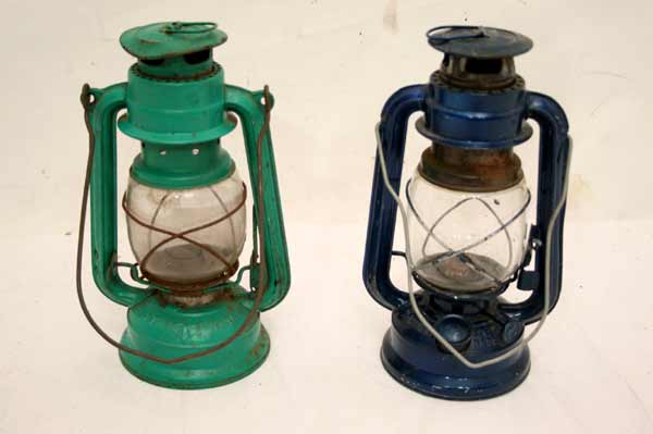 2 antike Petroliumslampen / Windlampen / Blau und Grün