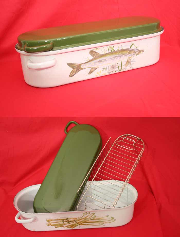 Toller großer emalierter Fischbräter / Bratpfanne mit Deckel / Bilder