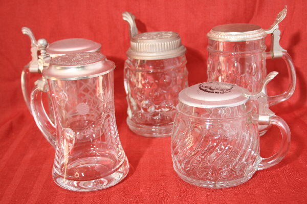 5 wunderschöne Bierkrüge / Glas m. Zinndeckel / Soldatenkrüge