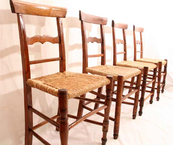 4 schöne antike Norddeutsche Holz Stühle / Binsengeflecht / Drechselarbeiten