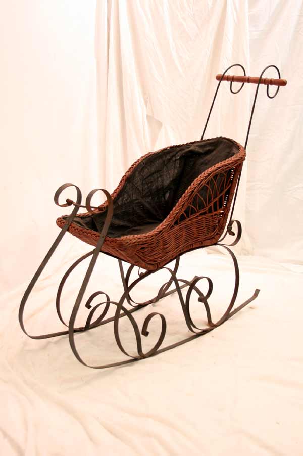 Schöner Puppenschlitten / Eisengestell / Korbgeflecht
