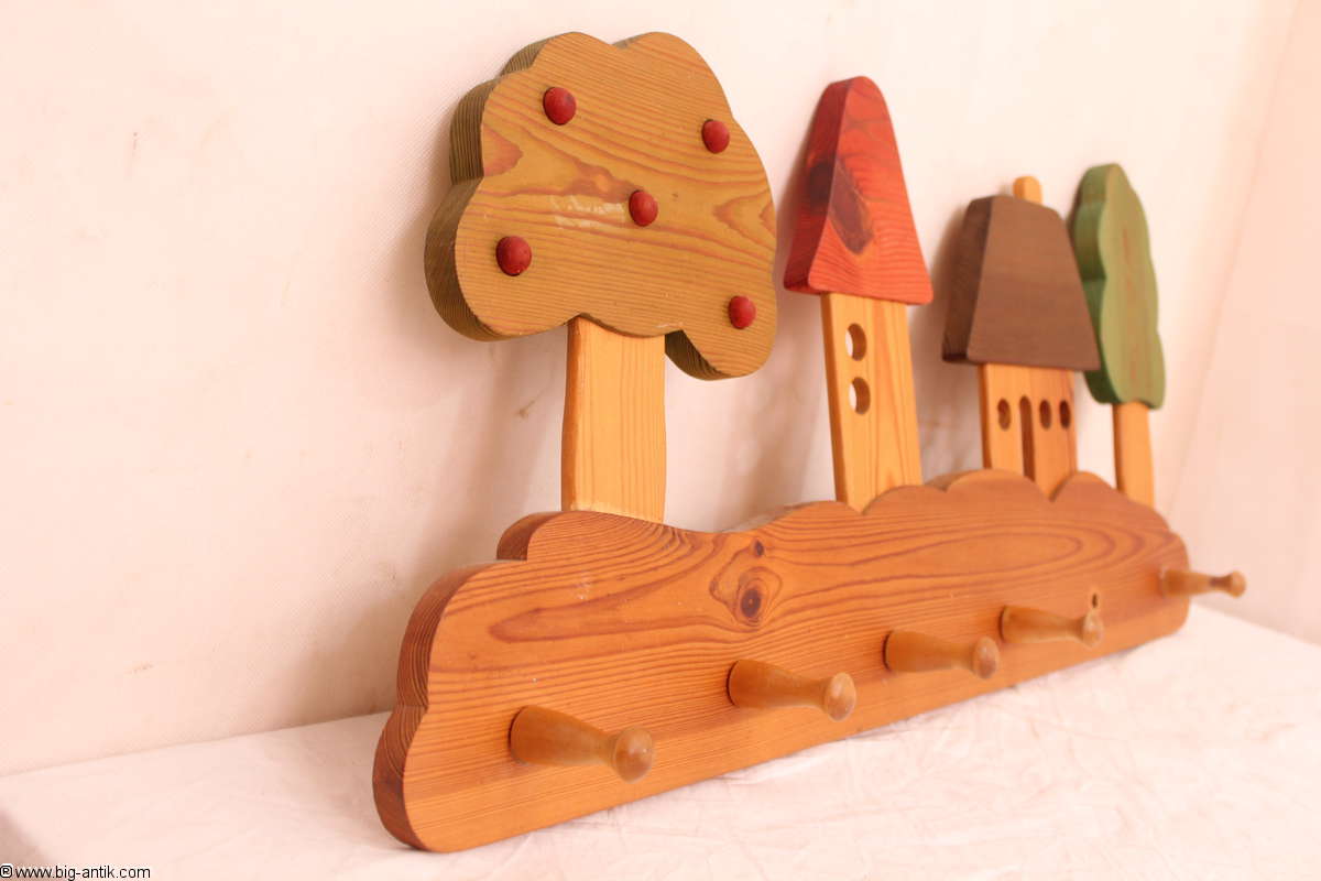 Wunderschöne Kinder Wandgarderobe / Massiv Holz / Schöne Schnitzereien Figuren farbige Bäume / Häuser