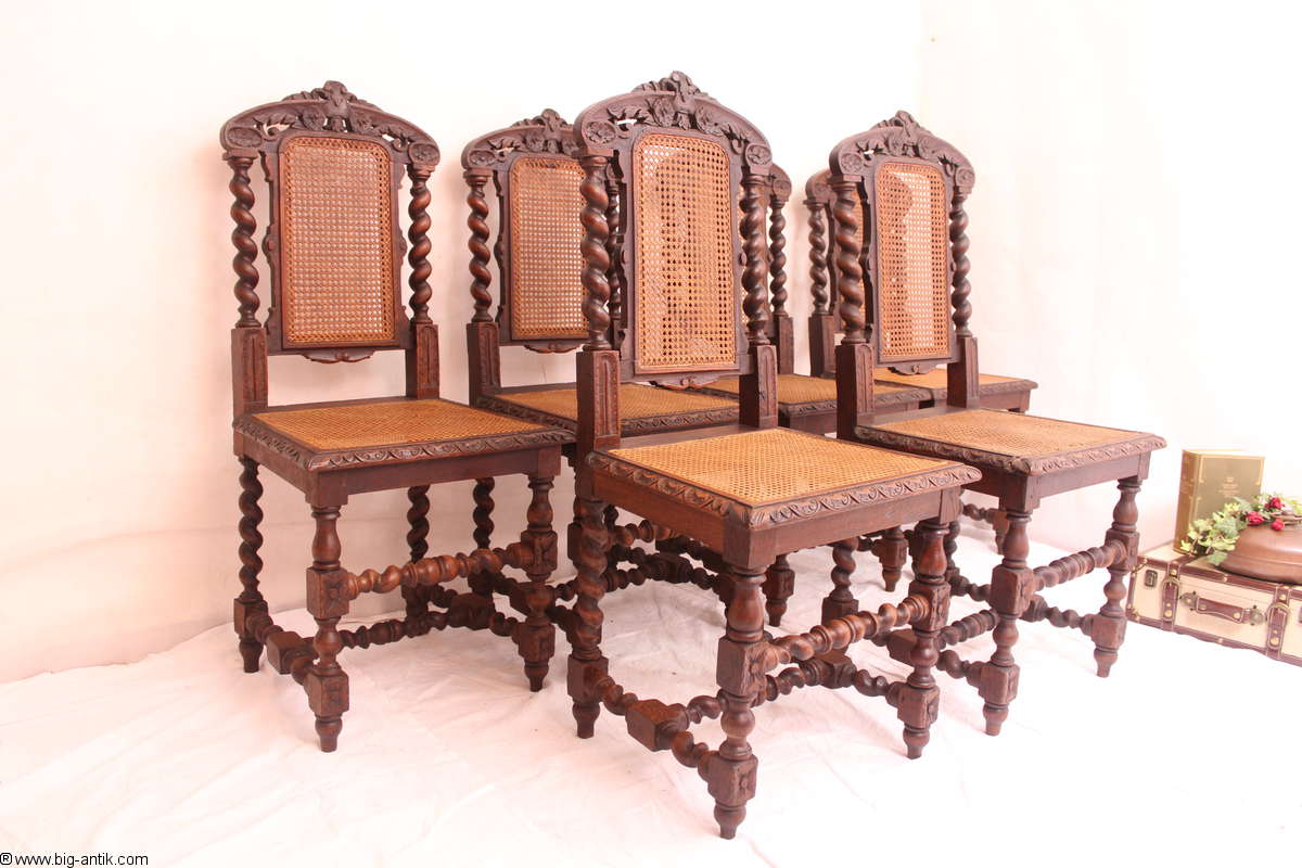 4 Zauberhafte antike Gründerzeitstühle / Holzstühle / Löwenköpfe / Metallgriffe / Sitzgeflecht / Drechselarbeiten
