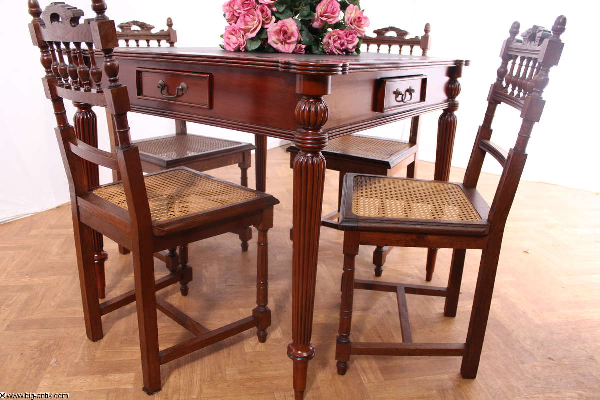Zauberhafte Sitzgruppe 4 antike Gründerzeit Jagdstühle Geflecht und Empire Stil Tisch / Schubladen