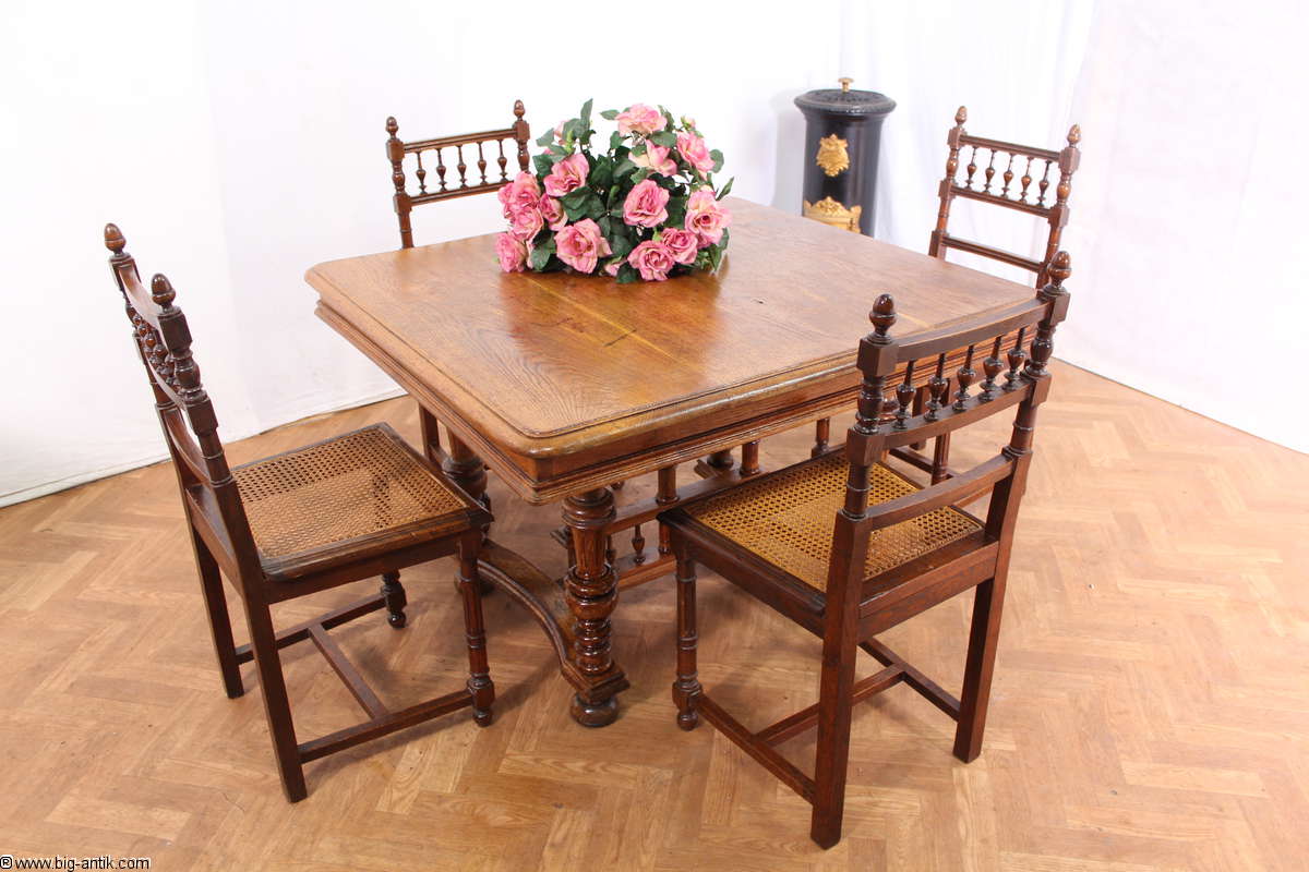 Antike Gründerzeit Sitzgruppe / Tisch und 4 Stühle / Eiche massiv / Schnitzereien / Sitzgeflecht