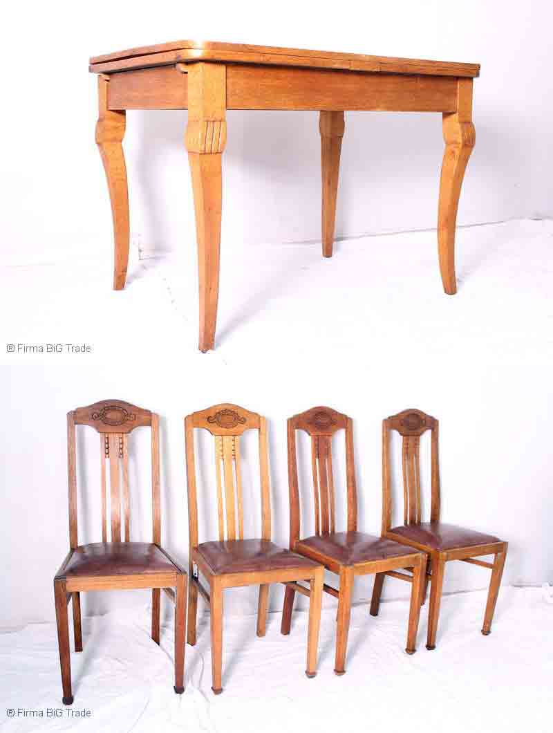 Antike Jugendstil Sitzgruppe Ausziehtisch u. 4 Stühle Eiche massiv geschwungene Beine