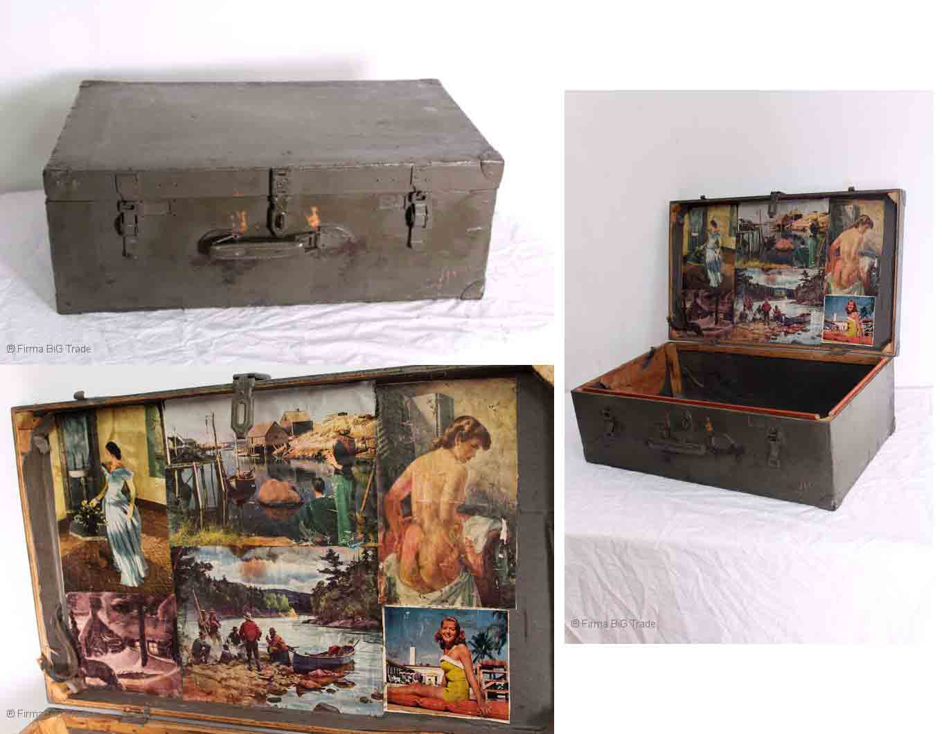 Antike Munitionskiste Flachdeckeltruhe Transportkiste Holzkiste antike Farbbilder Innenseite