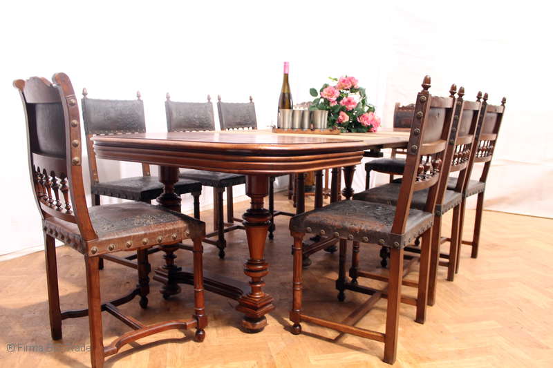Antike Gründerzeit Sitzgruppe Kulissentisch Esstisch u. 6 Lederstühle Banketttisch 3 Einlageplatten Tafel Ausziehbar