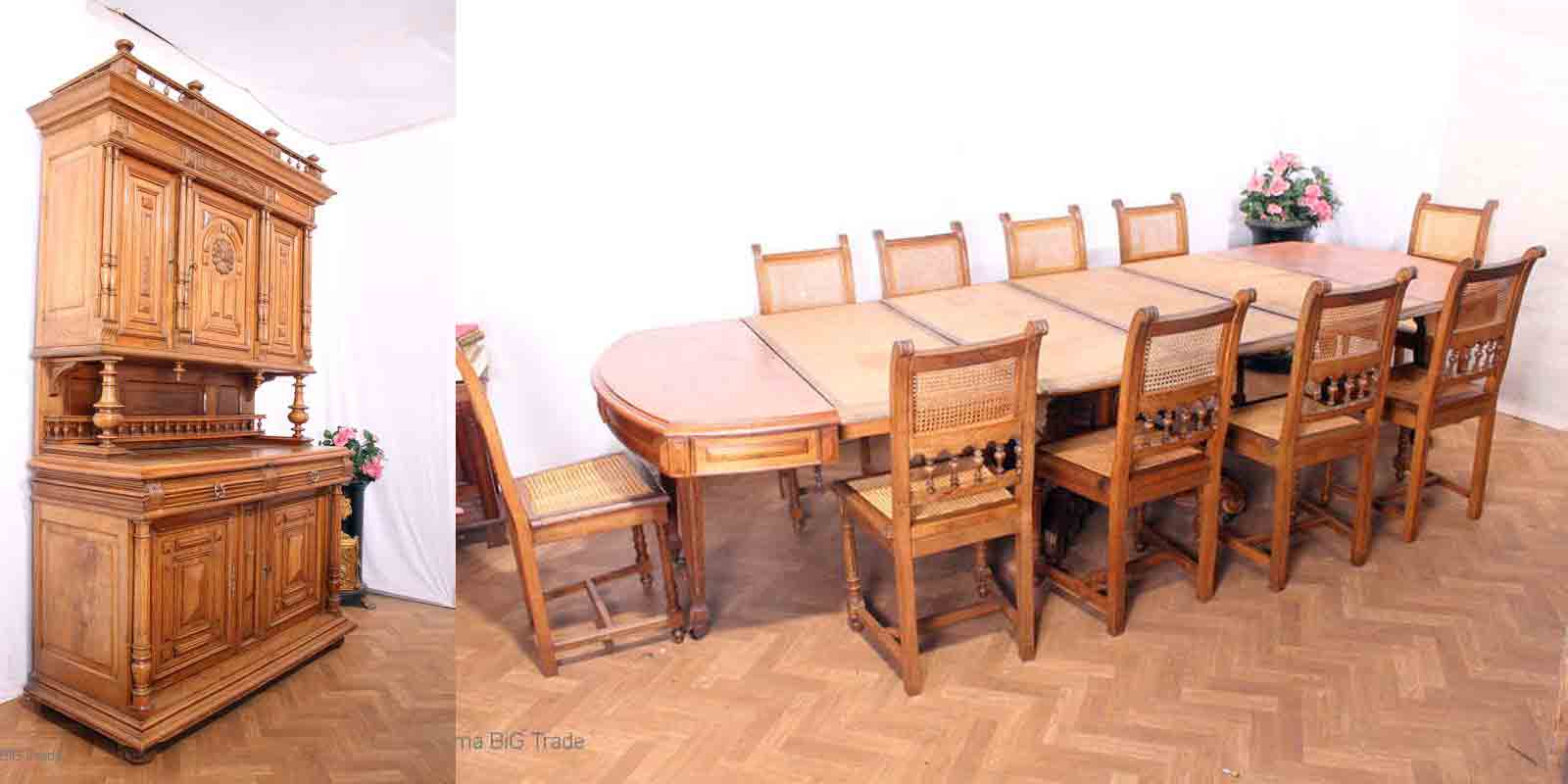 12 tlg. Antikes Gründerzeit Esszimmer, Kredenz, Kulissentisch u. 10 Stühle 5 Einlageplatten