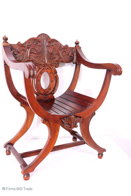 Prunk! Römer Stuhl / Thronstuhl / Scherenstuhl / Schnitzereien / Armlehnen Stuhl / Mahagoni Massiv