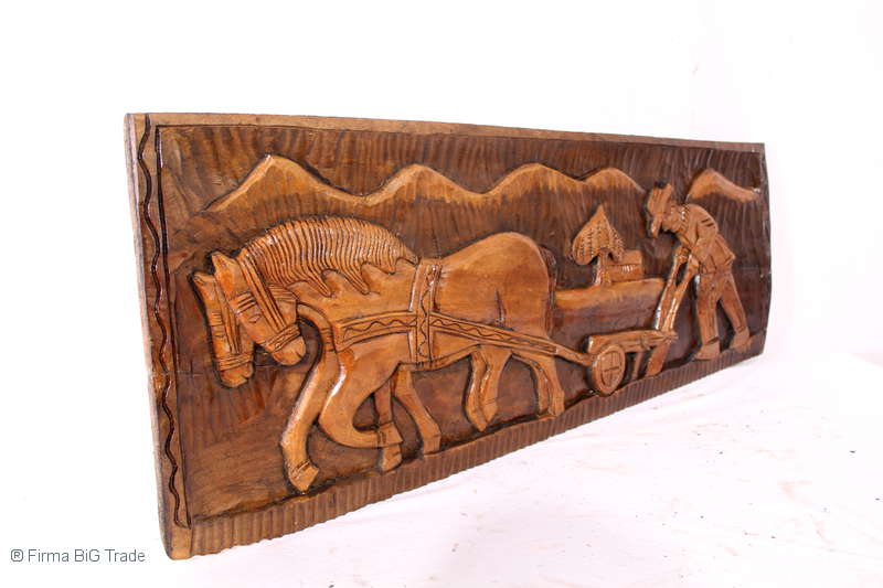 Wunderschönes großes Holzbild / Bauernschnitzereien / Wandbild Pflugwagen Pferde