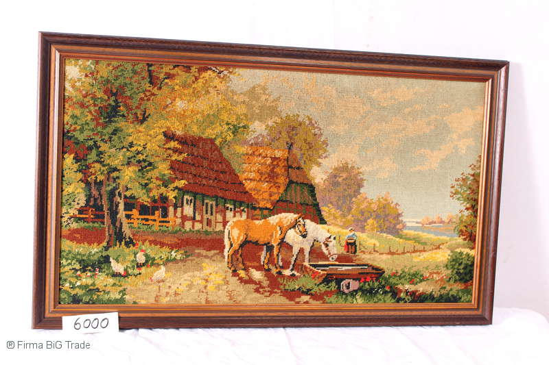 Schönes Großes Stickbild / Gobelin im Holzrahmen Bauernhof Pferde / Nr. 6000