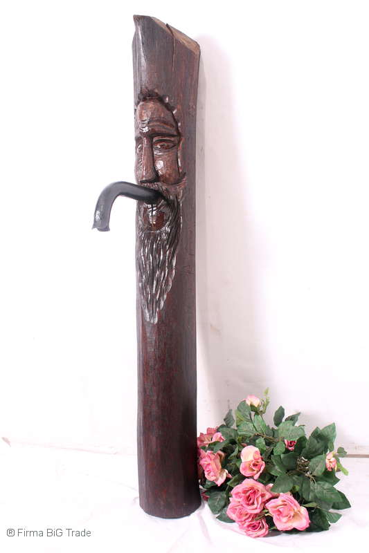 Ausgefallene Holzsäule Brunnenhahn Schnitzereien Totem Naturholz Fratzen Säule aus Baumholz