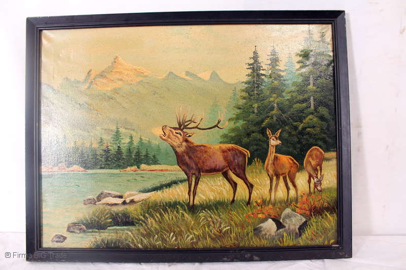 Antikes Gemälde auf Leinwand Jagd Berglanschaft Hirsche Alpenlandschaft Holzrahmen