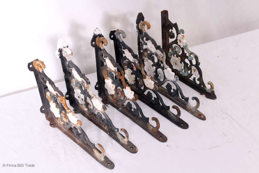6 antike Regalstützen Wandkonsolenstützen Schmiedeeisen Blumenverzierung / Gebrauchsspuren