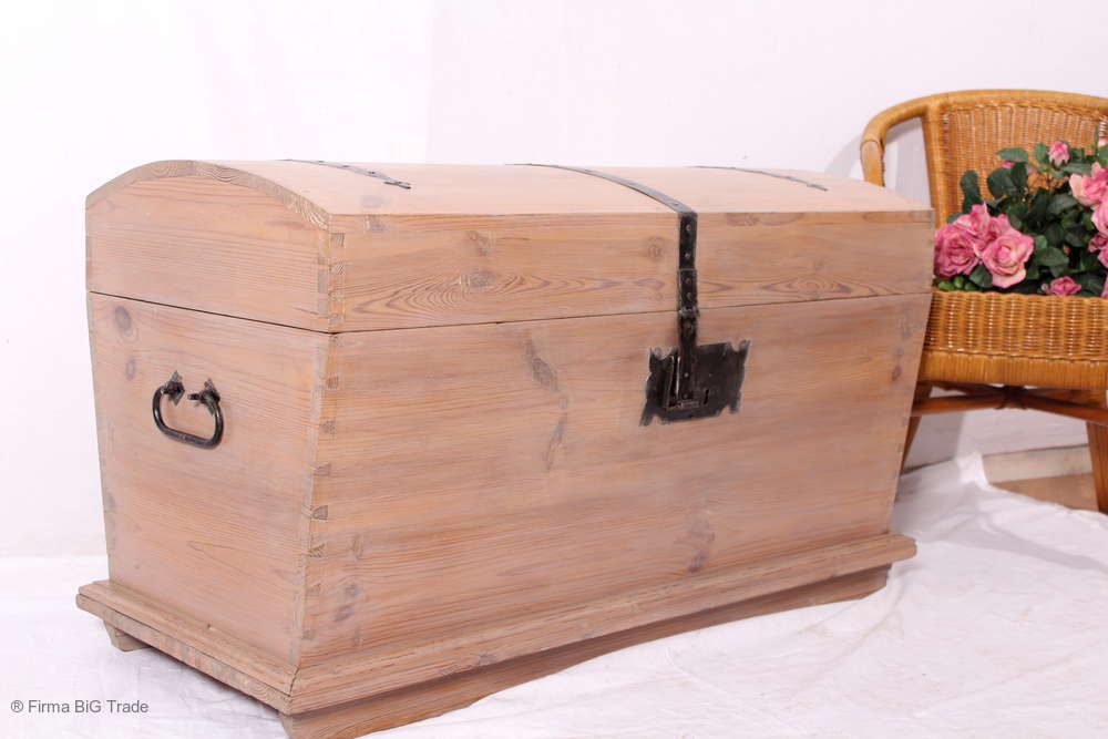 Prächtiger antiker Runddeckeltruhe Holztruhe Schlafzimmertruhe Hochzeittruhe Eisenbänder und Griffe
