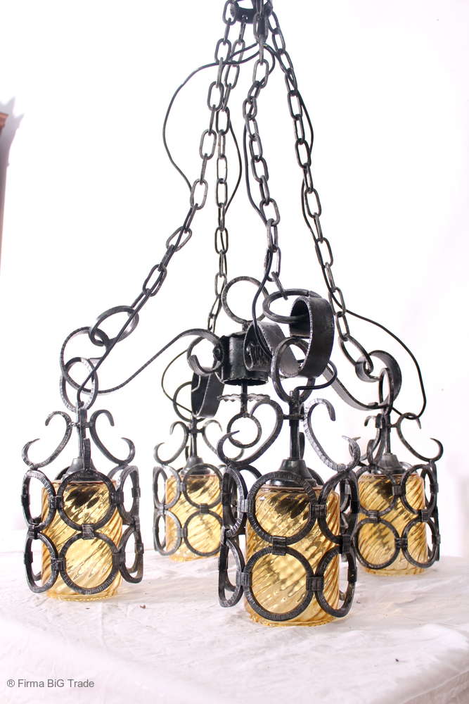SELTEN! Große Deckenlampe Bauernlampe Gaststtenlampe Schmiedeeisen 4 gelbe Glasschirme L4