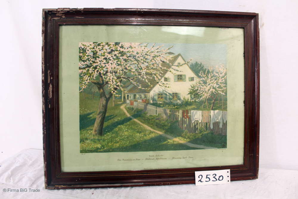 Antikes Jugendstil Farbbild im Holzrahmen Blooming Apple Trees / Blühende Apfelbäume / Nr. 2530