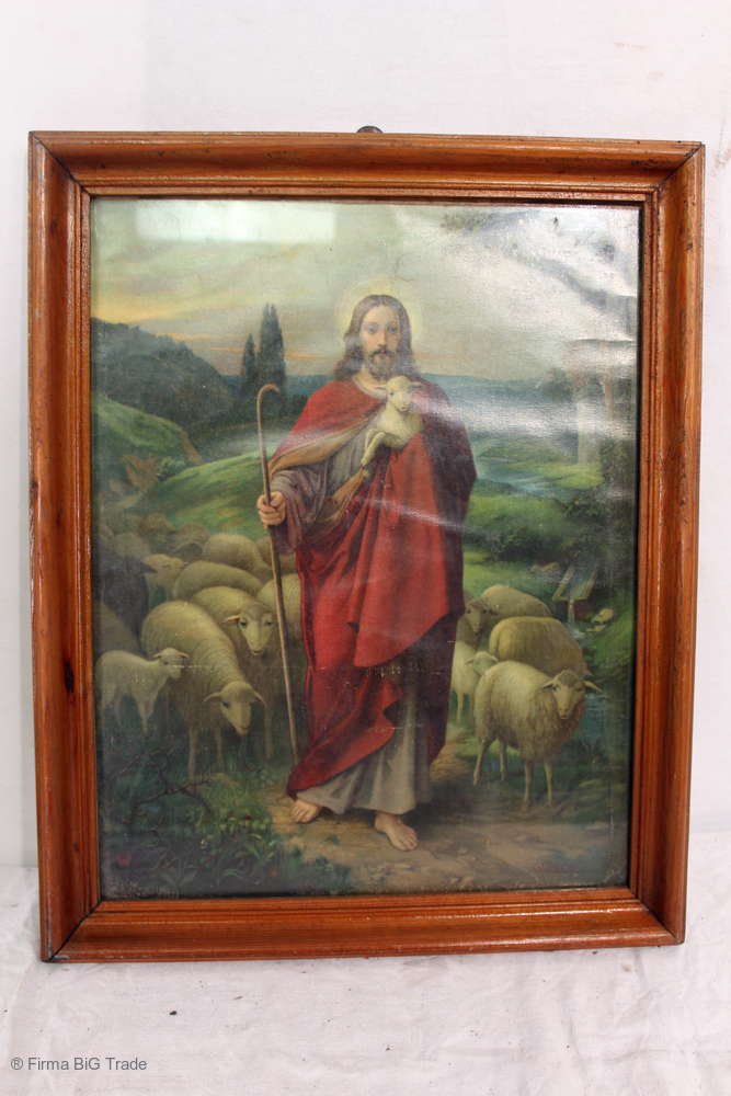 Antikes Jugendstil Farbbild / Jesus als Schäffer / Religiöses Bild / Holzrahmen / No. 2534