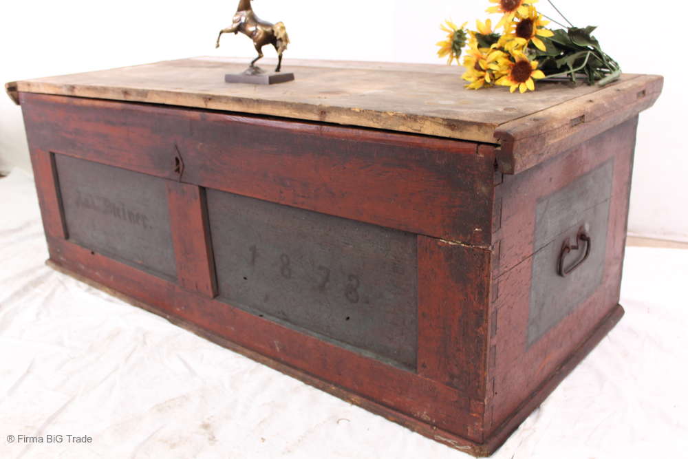 Große antike Biedermeier Hochzeittruhe Flachdeckeltruhe Holz Truhe / 1873 / zur Restaurierung