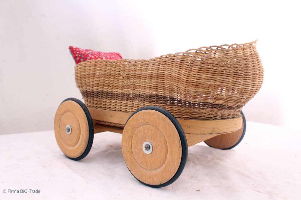 Schöner kleiner Puppenwagen Puppenbett mit Holzrändern / Geflecht / Zugwagen Holzgestell