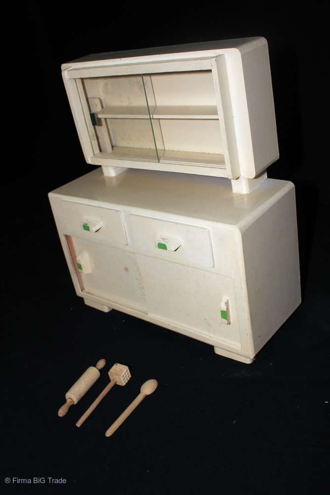 Schöner Puppenschrank Küchenschrank Schiebetür Schubkästchen Alt Weiß m. Küchenzubehör
