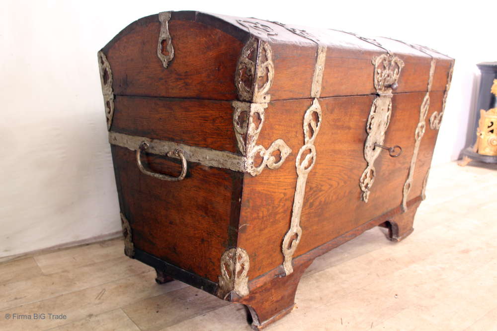 Prächtige museale Barock Truhe Runddeckeltruhe Hochzeittruhe Eisenbeschläge Holzräder Aussteuertruhe