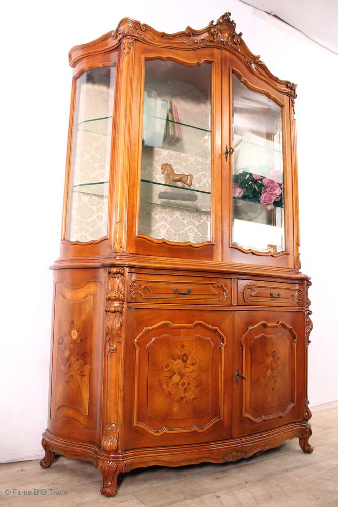 Zauberhafte bauchige Vitrine Barock Stil Glasvitrine Schnitzereien Intarsien 2 tlig. 2 Glasböden