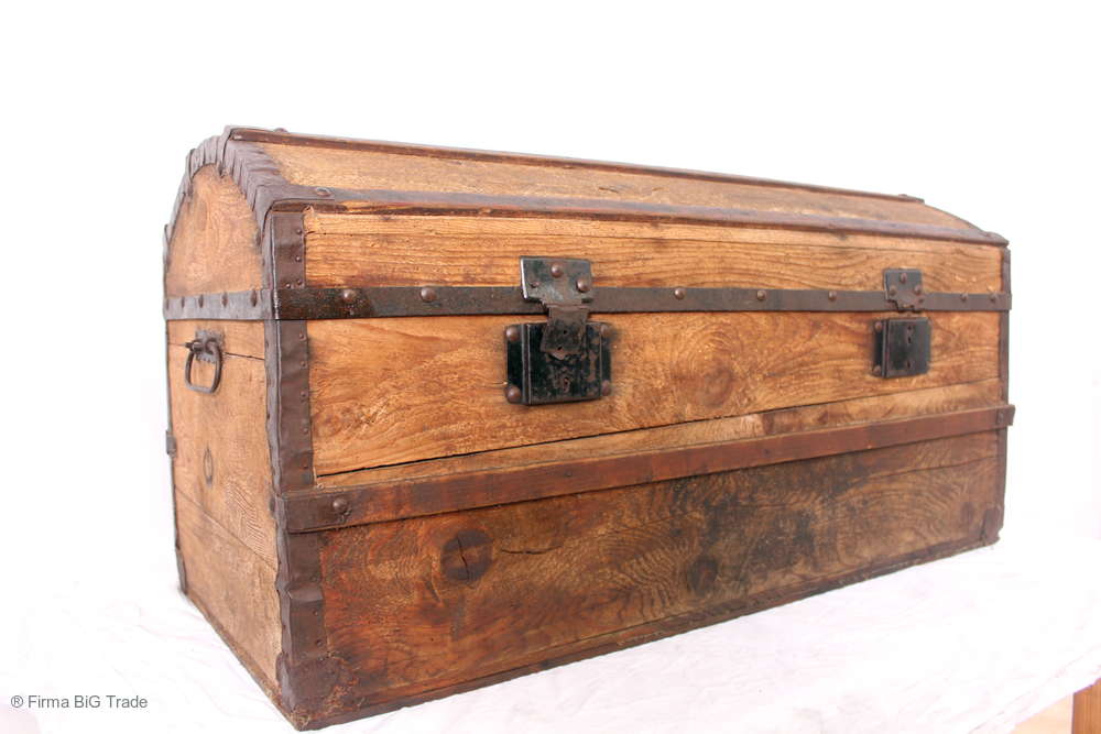 Antike Überseetruhe / Kutschertruhe Runddeckeltruhe Eisenbänder Droschken Kofferraum