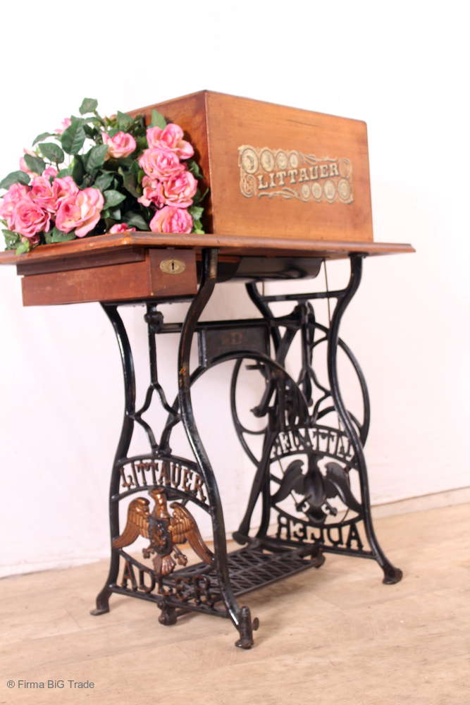 Antike LITTAUER Nähmaschine Nähtisch mit Deckel Guss-Gestell mit Verzierungen ADLER