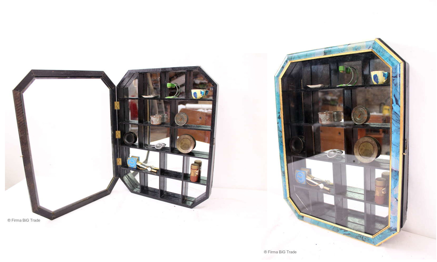 Wunderschöner verzierter Setzkasten / Vitrine / Glastür / Spiegel Rückwand / Viele Fächer m. Inhalt