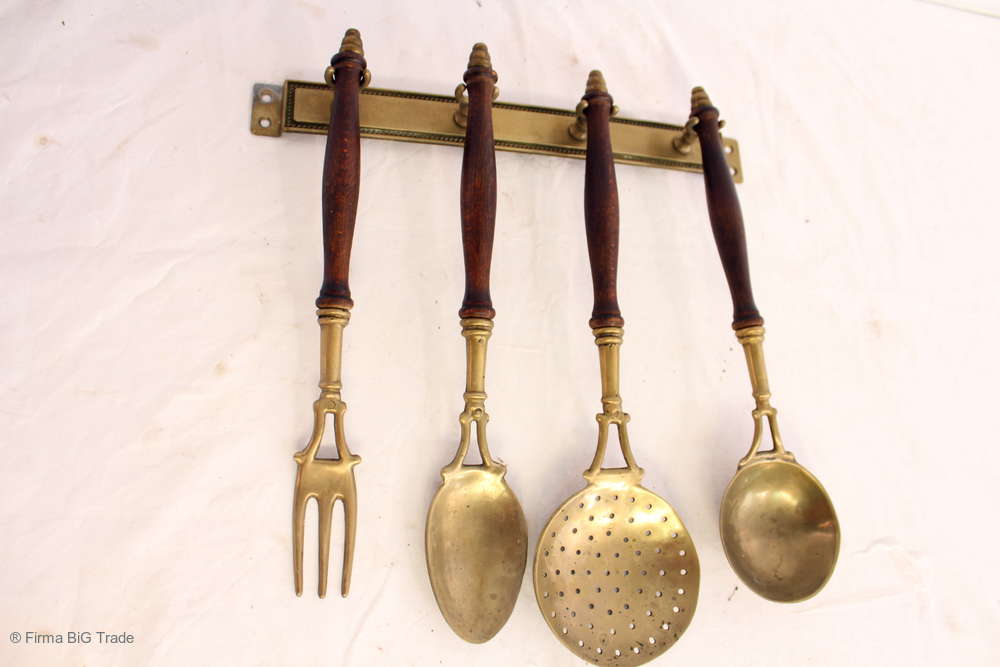 Schönes antikes 4tlg. Küchenbesteck Messingbesteck mit Wandhalterung Gabel Sieb Schöpfkelle
