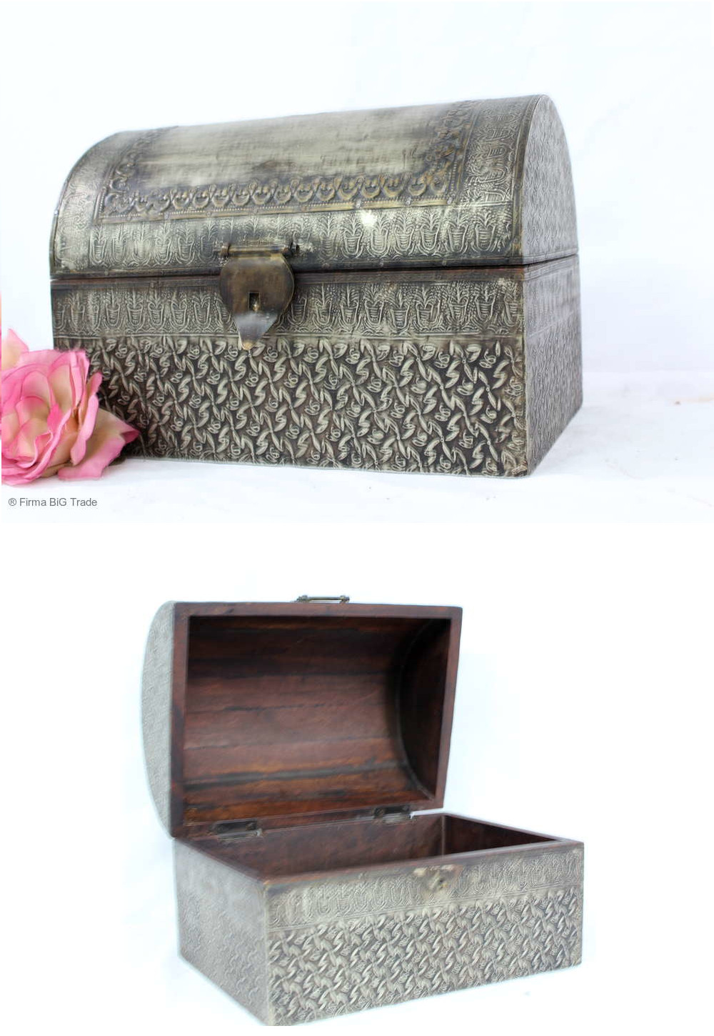 Antike Holzschatulle Runddeckel Schatzkiste Holzkiste mit verzierten Blechbeschlag