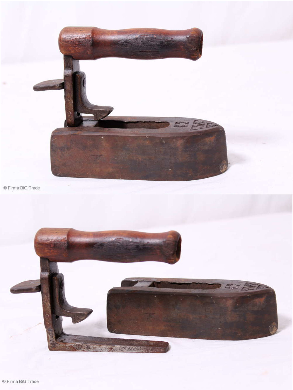 SELTEN! Kleines Museales Bügeleisen HHH Schneider Werkzeug Holzgriff 2teilig Sammlerstück