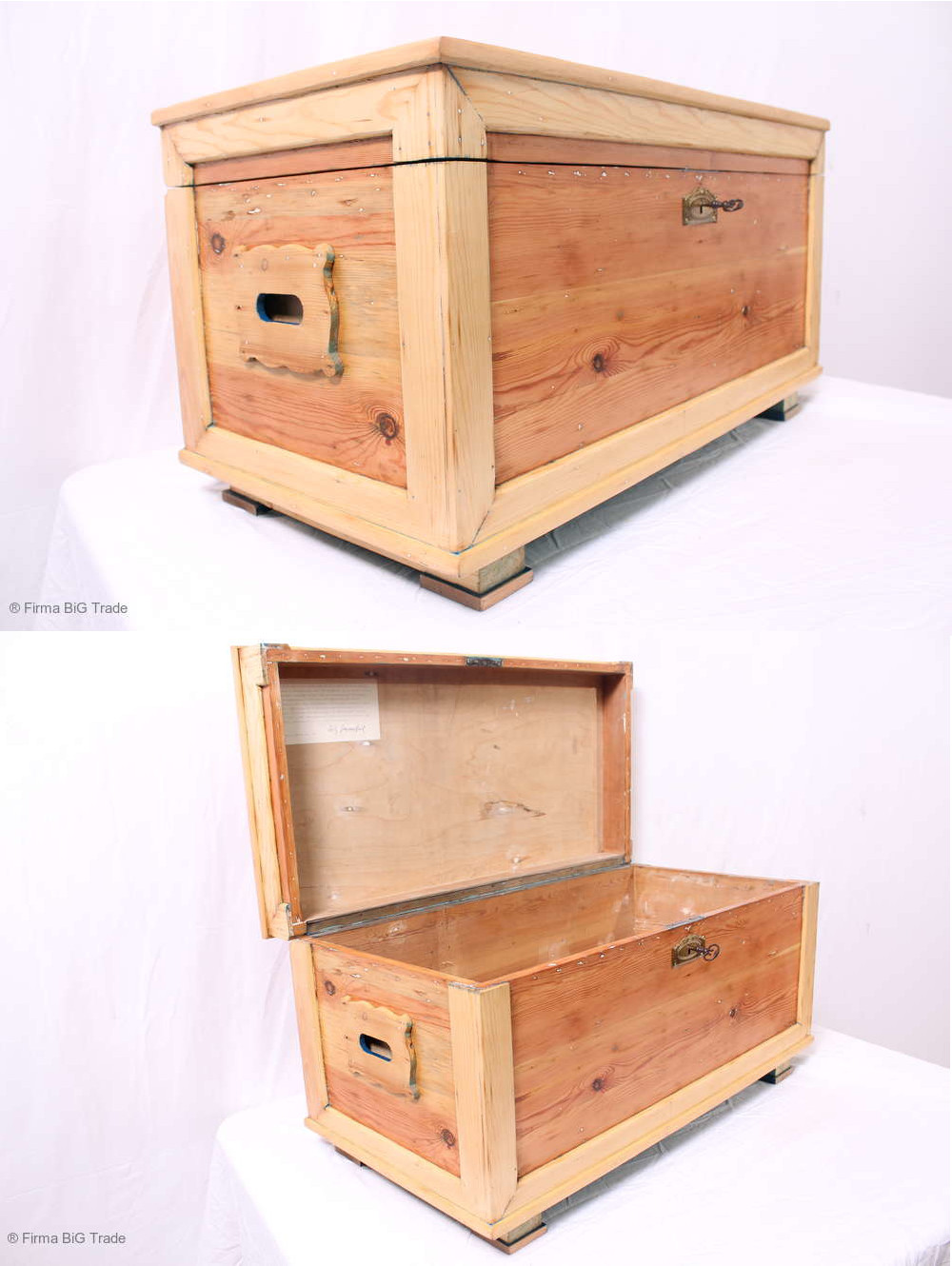 Antike Offizier Truhe mit Geschichte Holztruhe Flachdeckeltruhe Reisetruhe Weichholz massiv / Nr. 15
