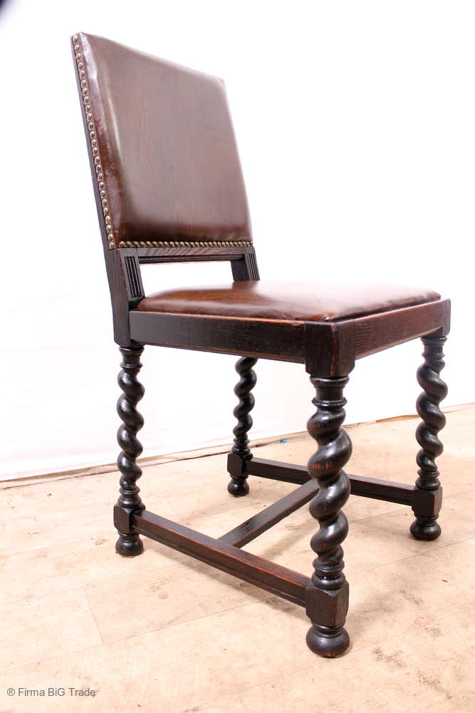 Antiker Jugendstil Lederstuhl Danziger Barock Gedrechselte Beine Tafelstuhl / Eiche / 3 Vorhanden / Nr. 463