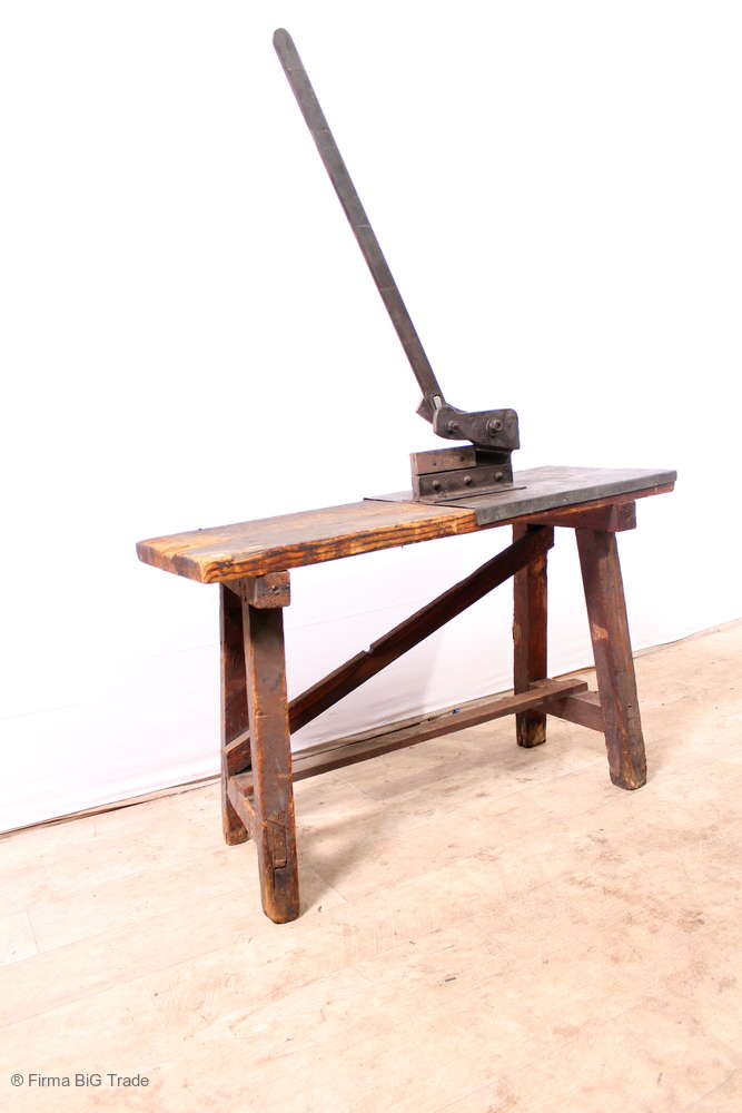 Museale Werkbank Schneidegerät Metallschere / Massives Holzgestell / Blechschere