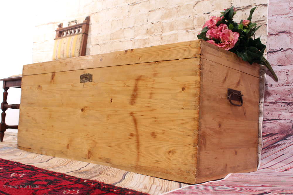 TOP! Große antike Jugendstil Flachdeckeltruhe Hochzeittruhe Couchtisch Weichholz massiv Eisengriffe