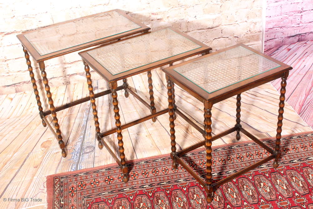 Bezauberndes Set engl. Tische 3 Tische Glastisch Beistelltische verschachtelbar gedrechselte Beine