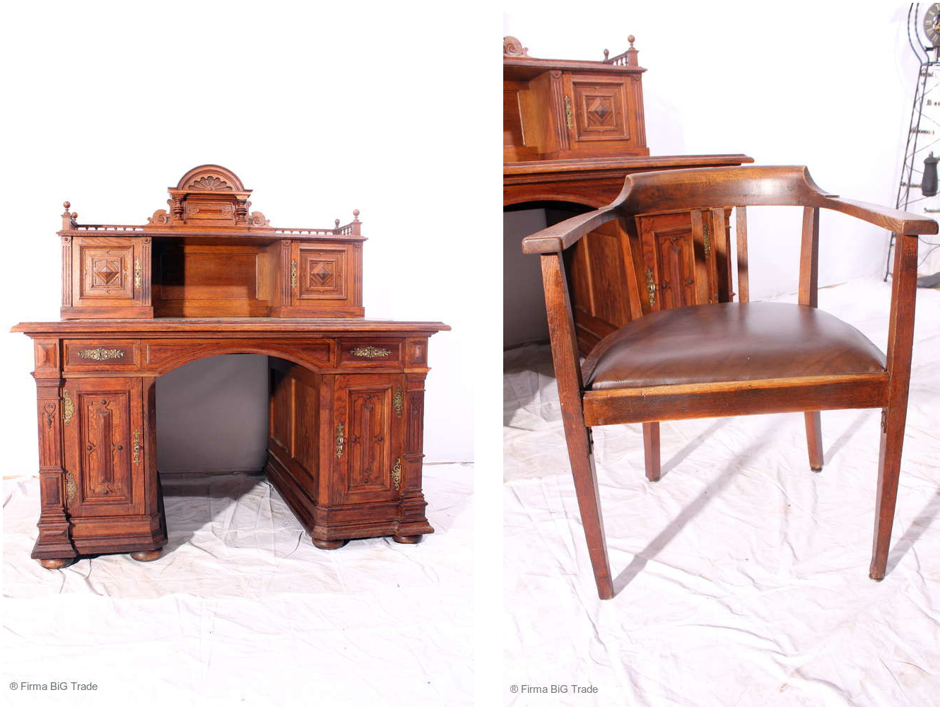 Prächtiger antiker Gründerzeit Herrenschreibtisch Bürotisch m. Aufsatz und Armlehnstuhl Eiche Massiv